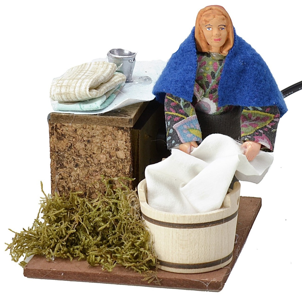 Lavandaia in movimento che riproduce l’azione di lavare i panni nella tinozza in legno. Scena per Presepe realizzata artigianalmente in Italia, ben rifinita nei dettagli con la statua vestita con abiti in tessuto ed un volto molto espressivo; il tutto è arricchito da muschio e da biancheria ripiegata accanto. L'articolo è funzionante a corrente