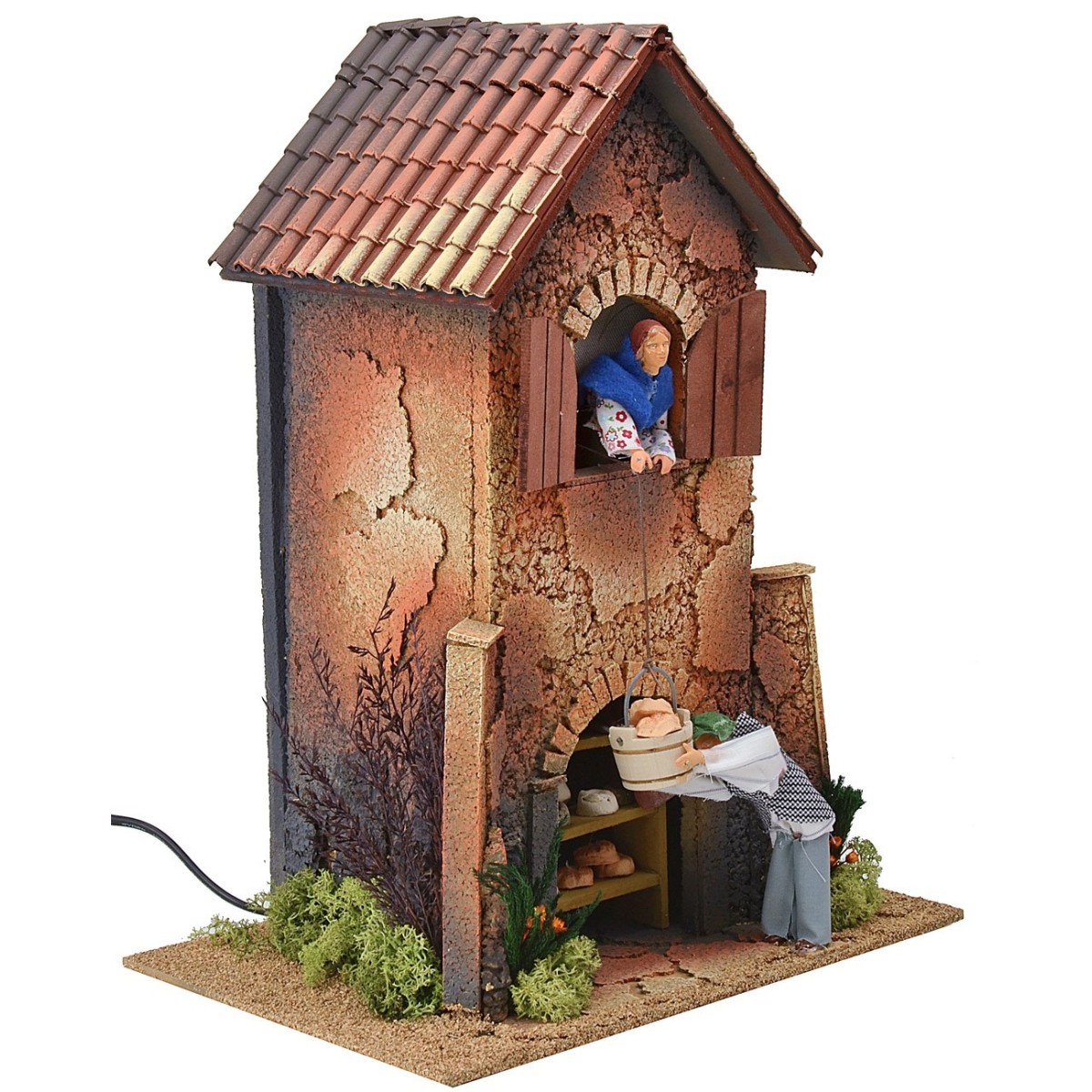 Scena con casa a più piani ben rifinita nei particolari, ma ad attrarre l’attenzione è il doppio movimento dei due personaggi: un uomo ed una donna che trasportano un cesto tramite una carrucola ai piani superiori. Questa ambientazione per Presepe è stata realizzata artigianalmente in Italia, ogni dettaglio è stato minuziosamente curato come, per esempio, le statue in movimento vestite con abiti in tessuto ed il colore apportato dai decori della vegetazione. L’articolo è funzionante a corrente.