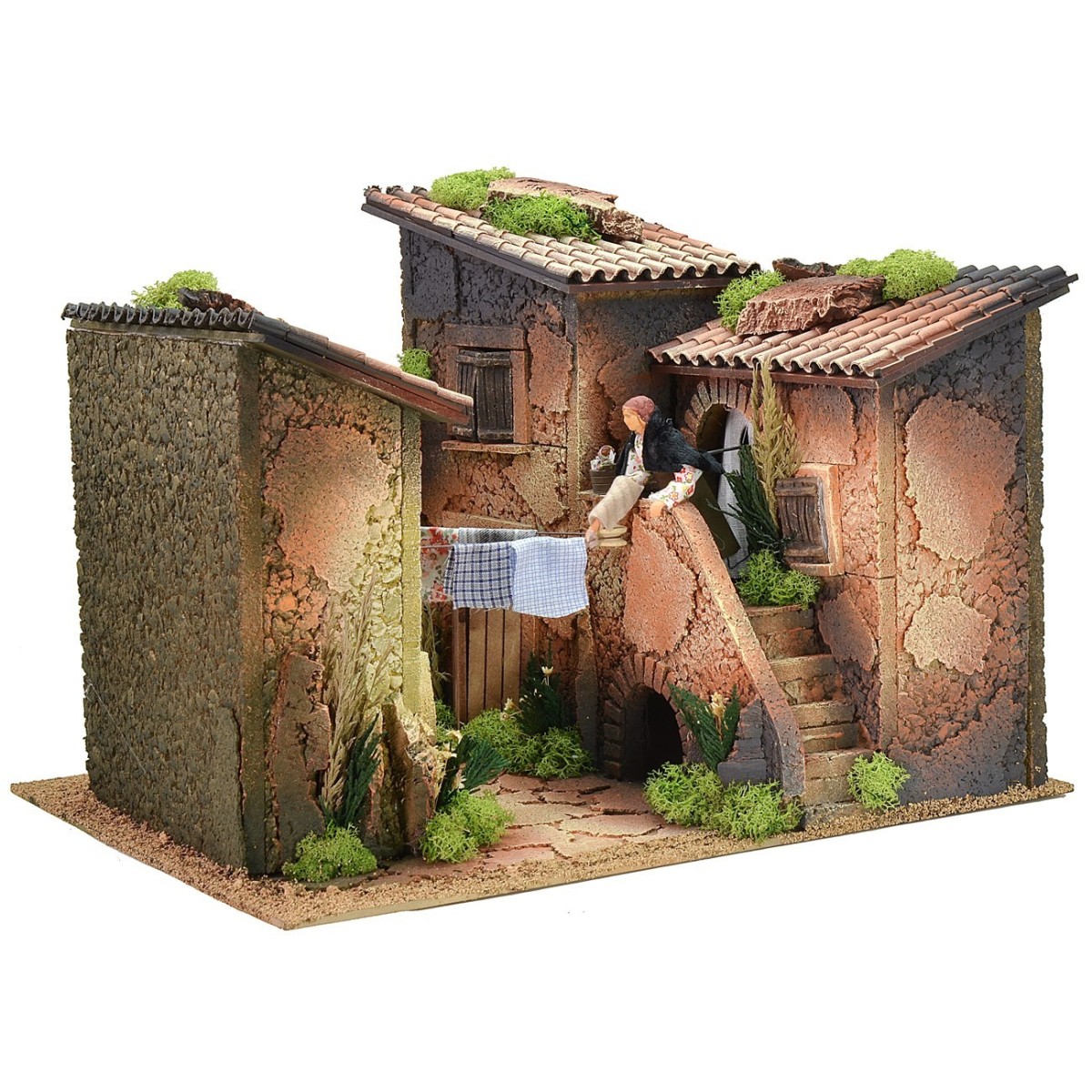 Bellissima scena per presepe composta da due abitazioni poste una di fronte all’altra collegate da un arco e minuziosamente rifinite. Oltre ad un’ambientazione ricca e curata, ad attrarre l’attenzione è il movimento della donna vestita con abiti in tessuto che stende i panni sullo stenditoio a carrucola ancorato alle pareti. Questo articolo per presepe è stato realizzato artigianalmente in Italia ed è funzionante a corrente. La scena può essere illuminata con luci che troverete nei prodotti correlati sotto la tabella, facendo dei fori alle abitazioni.
