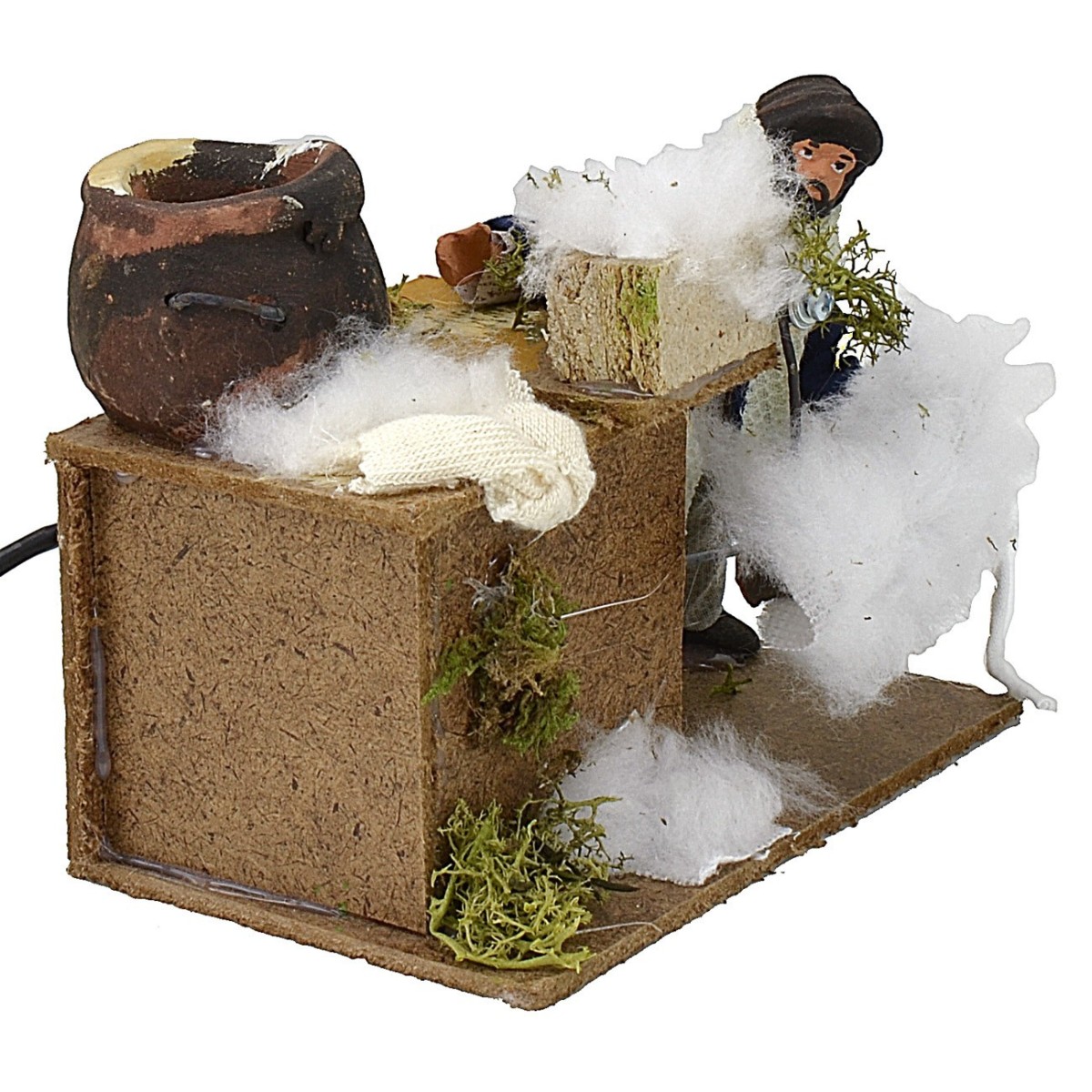 Lanaiolo 10 cm in movimento che fila la lana simula la filatura della lana. La statua è di terracotta con abiti in tessuto, i colori dei vestiti e del viso possono variare rispetto alla foto. Prodotto realizzato interamente a mano da artigiani italiani in legno sughero, muschio e terracotta.