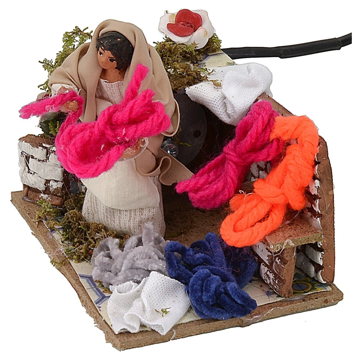Venditrice di gomitoli in lana con movimento, la commerciante muove il busto simulando un invito alla clientela ad acquistare. La statua è di terracotta con abiti in tessuto, i colori dei vestiti e del viso possono variare rispetto alla foto. Prodotto realizzato interamente a mano da artigiani italiani in legno sughero, muschio e terracotta. Il prodotto è funzionante a corrente.