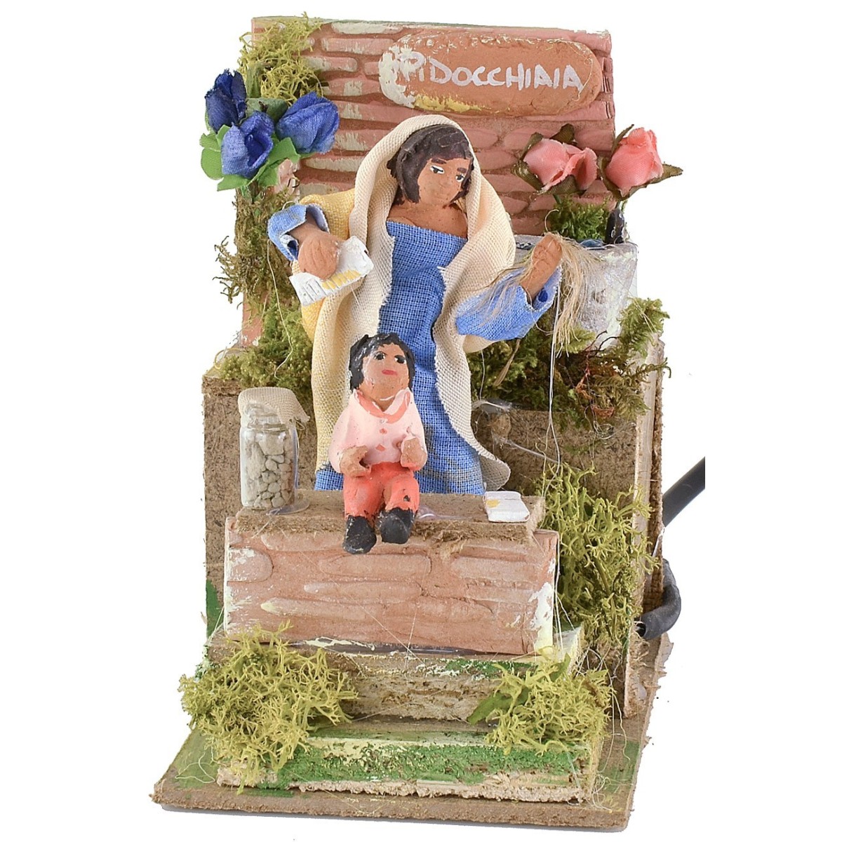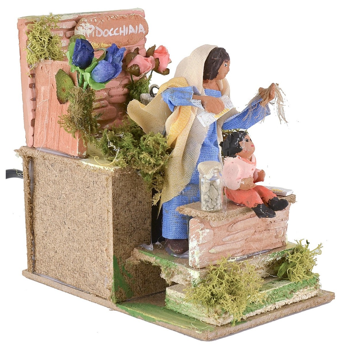 Mamma in movimento che toglie i pidocchi dal capo della figlia. La pidocchiaia, grazie al movimento del busto, si china simulando l'azione di pulire la testa alla bambina. Nell'ambientazione per presepe sono presenti ciuffetti di vegetazione, un secchio di acqua e dei fiori. La statua di altezza 10 cm è in terracotta con abiti in tessuto, i colori dei vestiti e del viso possono variare rispetto alla foto. L'articolo è funzionante a corrente ed è stato realizzato interamente a mano da artigiani italiani con lego sughero e terracotta. Nei prodotti correlati sotto la tabella sono presenti accessori per presepe da utilizzare per arricchire ulteriormente la scena.
