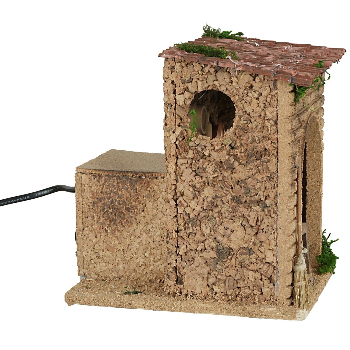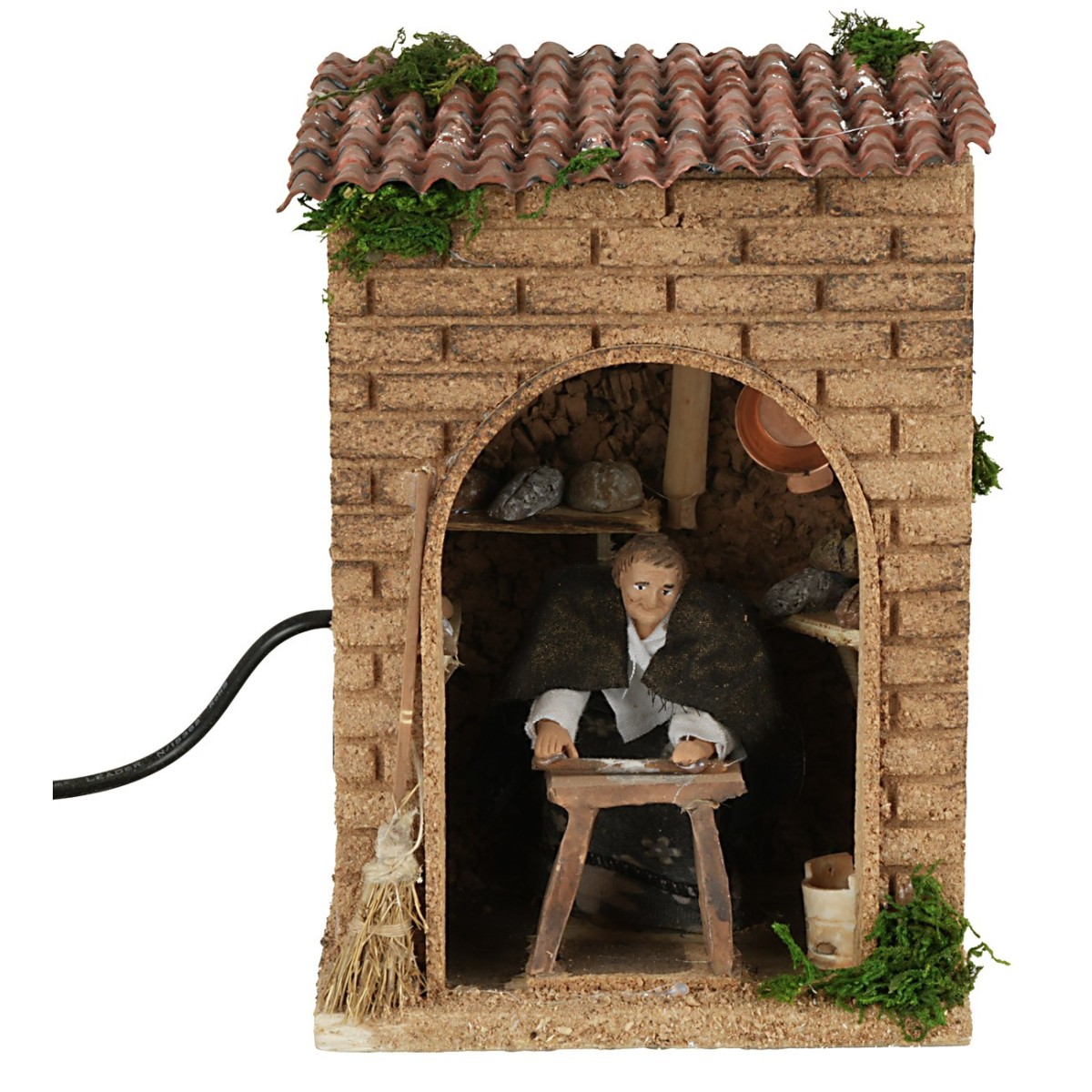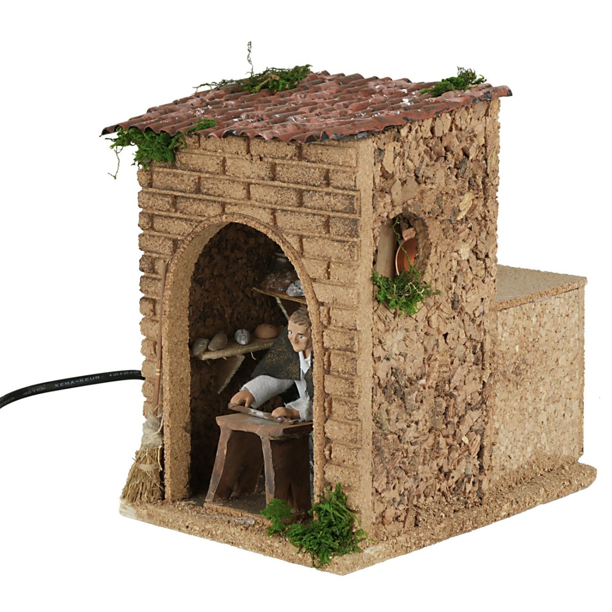 Massaia in terracotta funzionante serie cm 10. La donna si china per stendere l'impasto, è vestita con abiti in tessuto e la scena è rifinita con piccoli dettagli. L'articolo funzionante a corrente è stato realizzato da artigiani italiani. Si precisa che la statua fa parte della serie 10cm, ma essendo chinata e non eretta ha un'altezza di circa 8 cm.