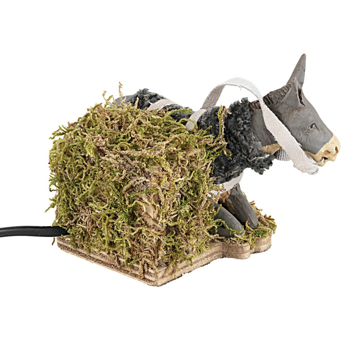 Asino della serie 12 cm che compie un movimento a destra e sinistra con la testa. La statuina è realizzata in terracotta e dipinta a mano in Italia da sapienti mani artigiane con abiti in tessuto ben rifiniti. La figura per il Presepe classico e/o napoletano che misura realmente 6 cm, è realizzata in terracotta ed è funzionante a corrente. Si precisa che i particolari del prodotto possono variare in quanto realizzato artigianalmente.