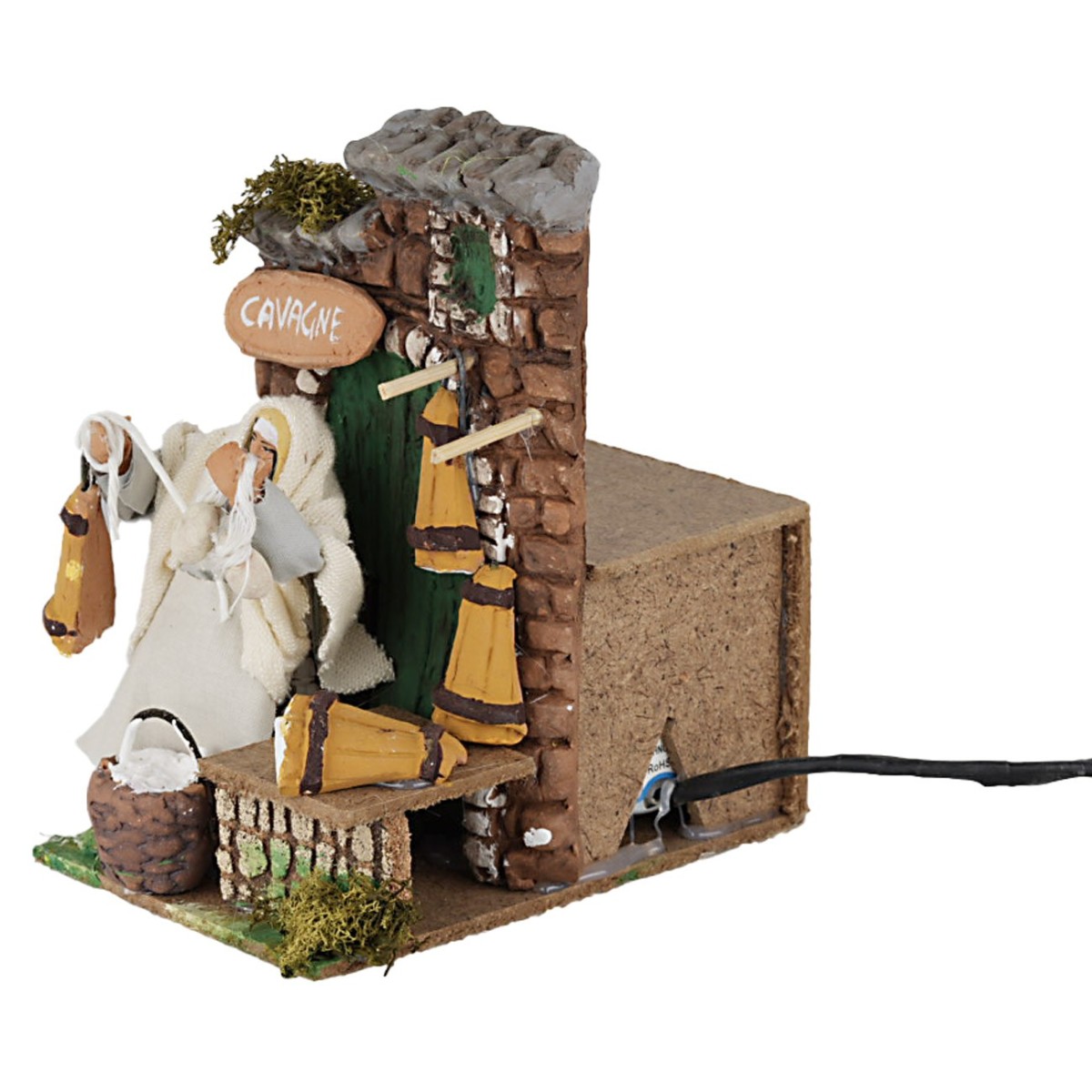 Venditrice che, grazie al movimento del suo busto, invita i clienti a comprare le cavagne. La statua è di terracotta con abiti in tessuto, i colori dei vestiti e del viso possono variare rispetto alla foto. Prodotto realizzato interamente a mano da artigiani italiani in legno sughero, muschio e terracotta. Il prodotto è funzionante a corrente.