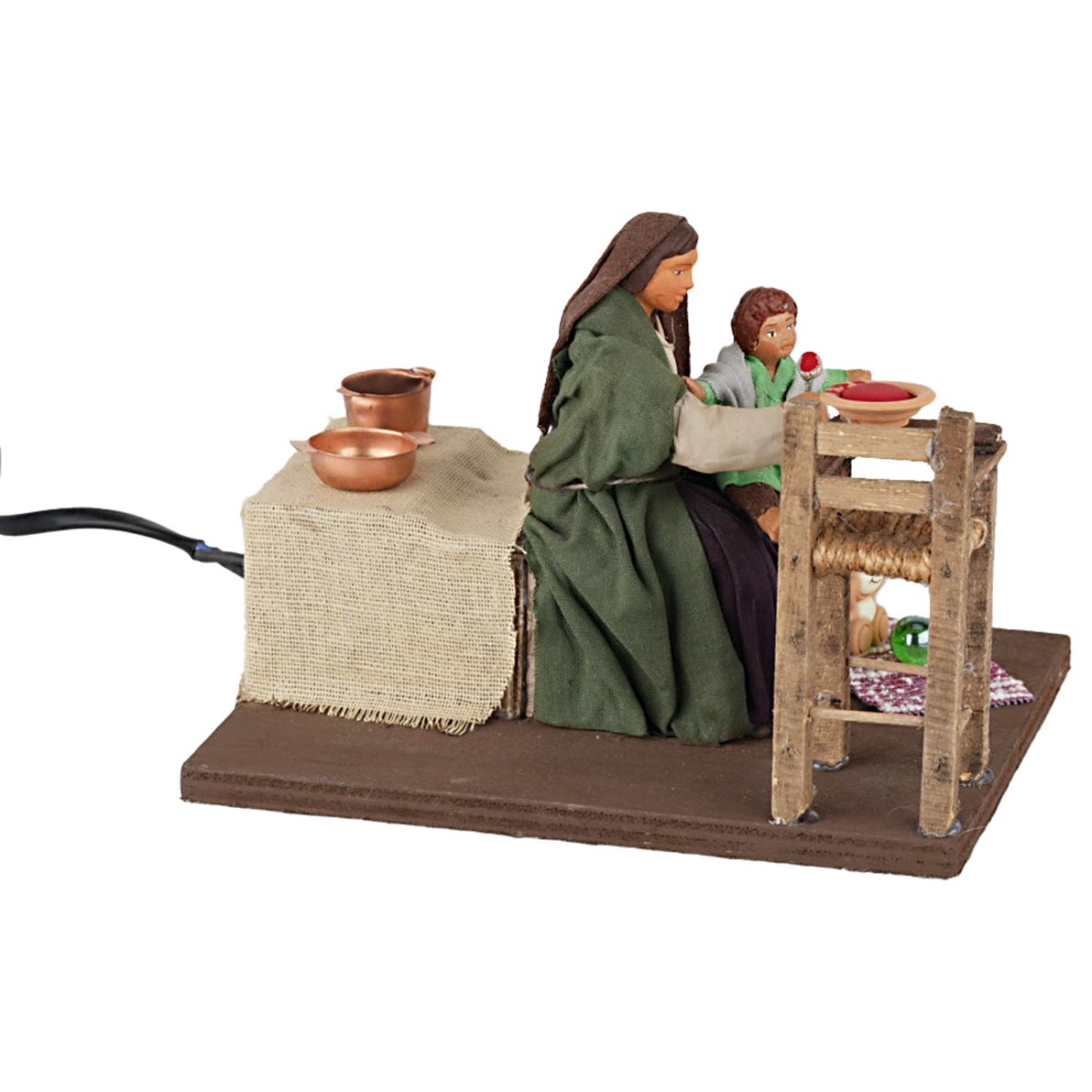 La mamma simula l'azione di nutrire il figlio che tiene in braccio, muovendo il braccio con delicatezza. La statua è di terracotta con abiti in tessuto, i colori dei vestiti e del viso possono variare rispetto alla foto. Prodotto realizzato interamente a mano da artigiani italiani in legno sughero, muschio e terracotta. Il prodotto è funzionante a corrente.