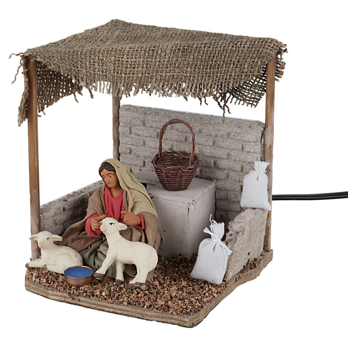 Donna che, con il movimento del braccio, si prede cura degli agnelli. La statuina è realizzata in terracotta e dipinta a mano in Italia da sapienti mani artigiane con abiti in tessuto ben rifiniti. La figura per il Presepe classico e/o napoletano è realizzata in terracotta ed è funzionante a corrente. Si precisa che i particolari del prodotto possono variare in quanto realizzato artigianalmente.