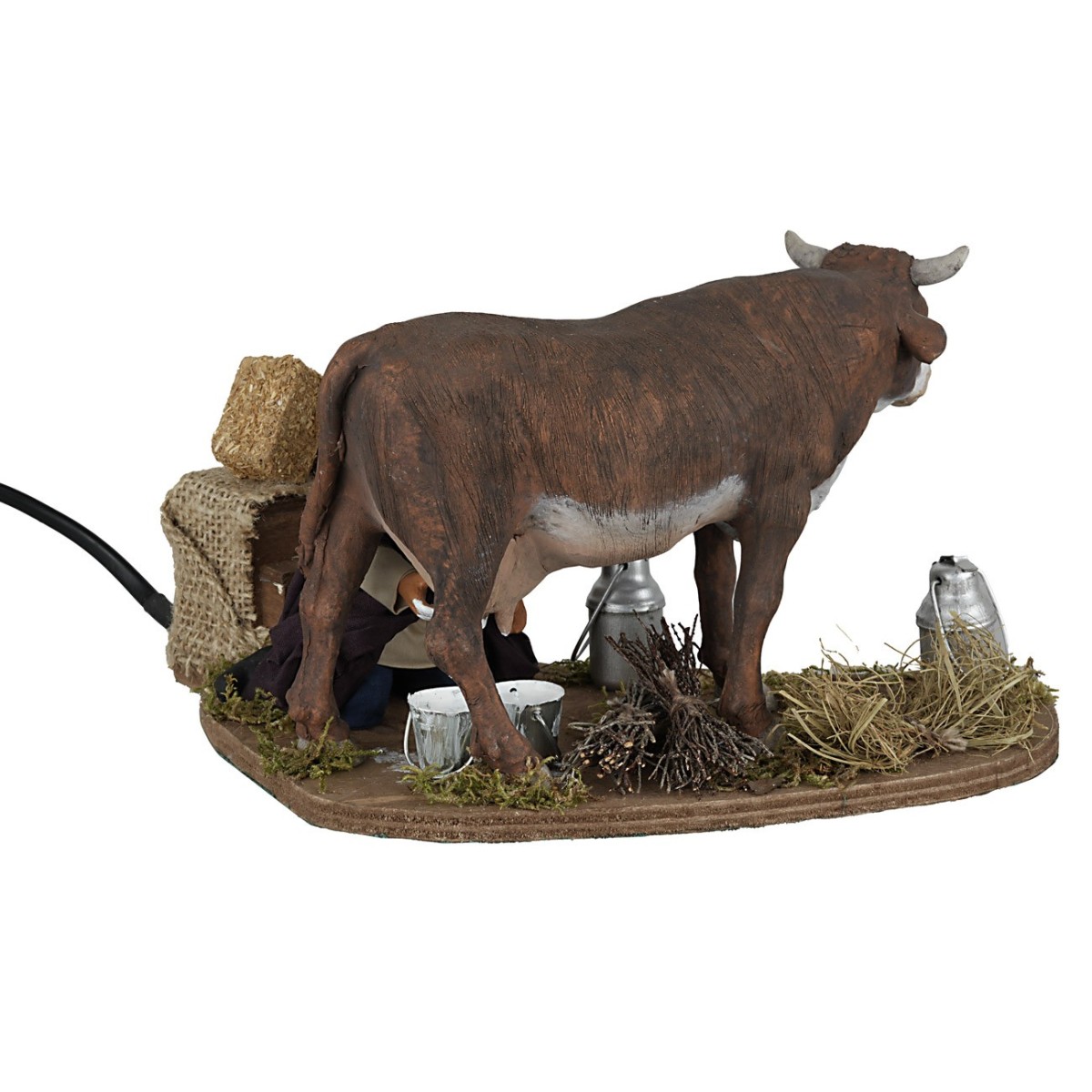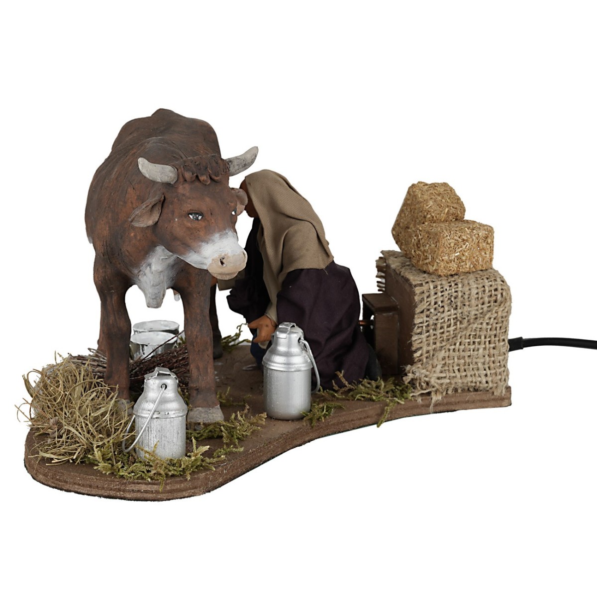 Uomo che, con il movimento del braccio, imita l'azione di mungere. La statuina è realizzata in terracotta e dipinta a mano in Italia da sapienti mani artigiane con abiti in tessuto ben rifiniti. La figura per il Presepe classico e/o napoletano è realizzata in terracotta ed è funzionante a corrente. Si precisa che i particolari del prodotto possono variare in quanto realizzato artigianalmente.