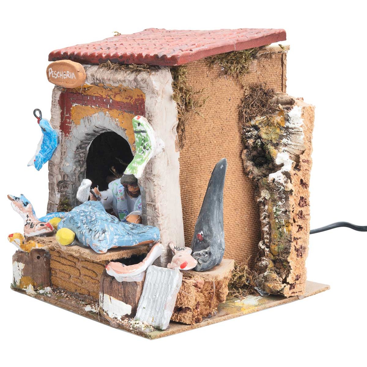 La scena raffigura l’artigiano all’interno della pescheria: il personaggio muove il braccio destro impugnando una piccola mannaretta, simulando il taglio e la preparazione del pesce sul banco, mentre una luce interna illumina la bottega, ricreando fedelmente l’antico mestiere.