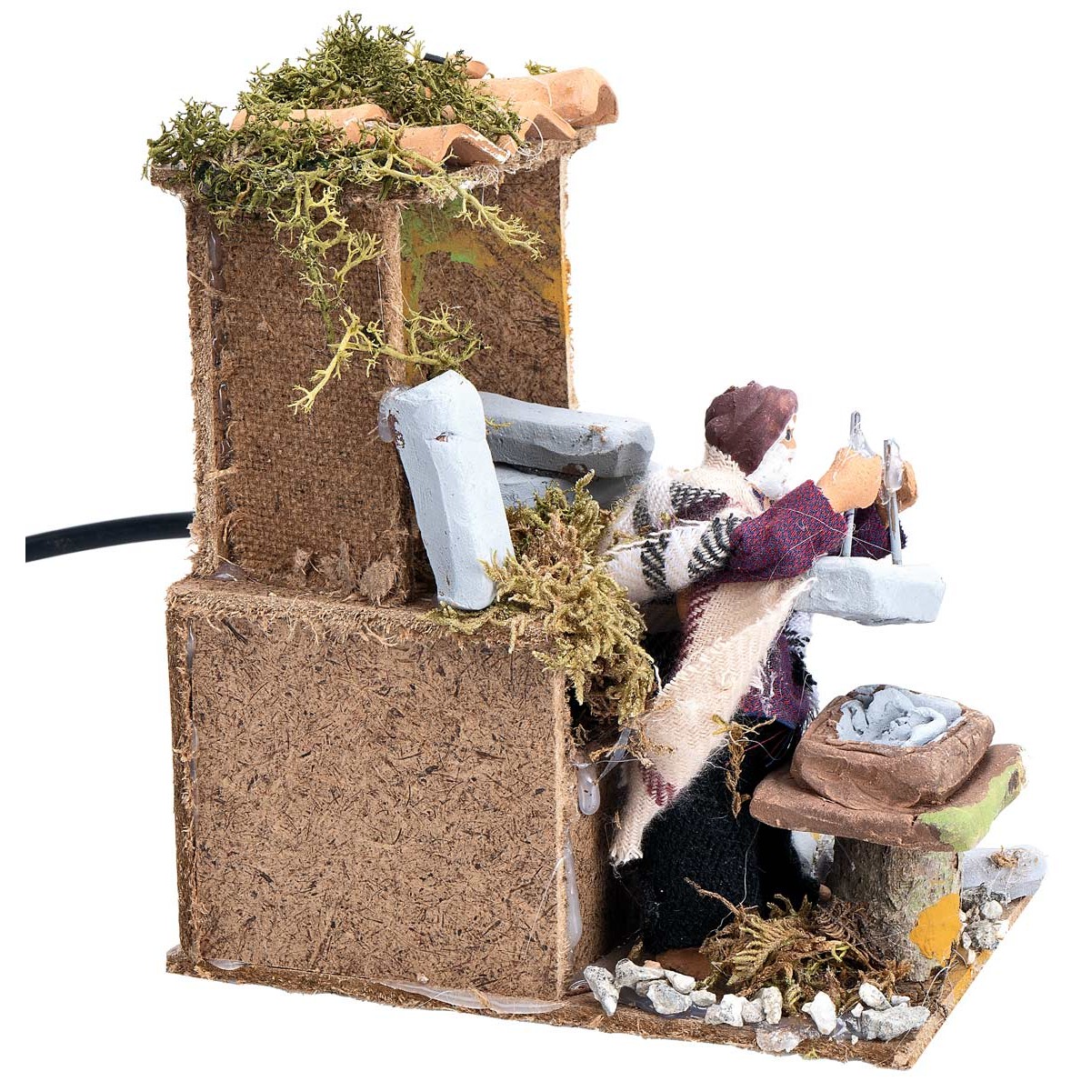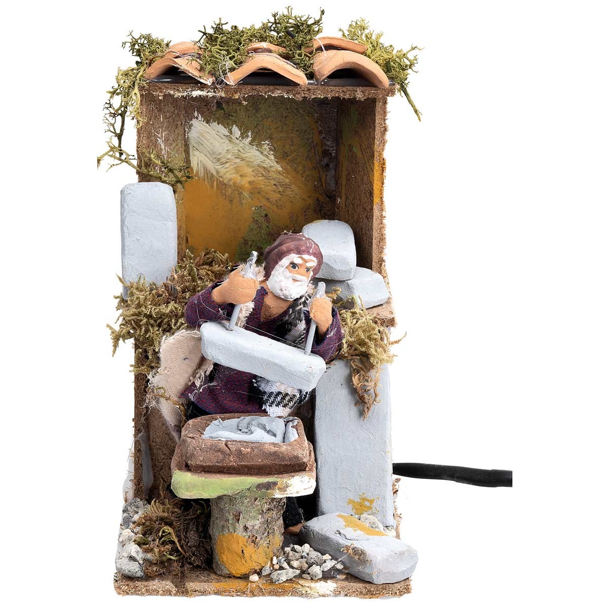L’ambientazione è composta da una piccola struttura con tetto in tegole e blocchi di pietra, che ricrea fedelmente l’atmosfera della bottega artigianale.