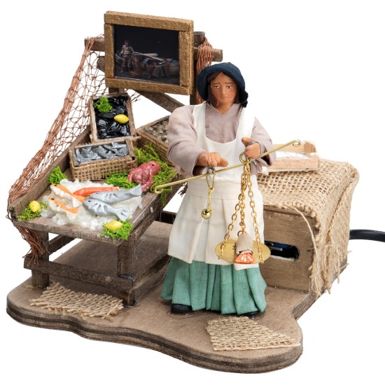 L’ambientazione è completata da cassette di pesce, rete da pesca e dettagli artigianali che rendono la scena particolarmente curata e vivace, ideale per arricchire ambientazioni di mercato nel presepe.