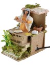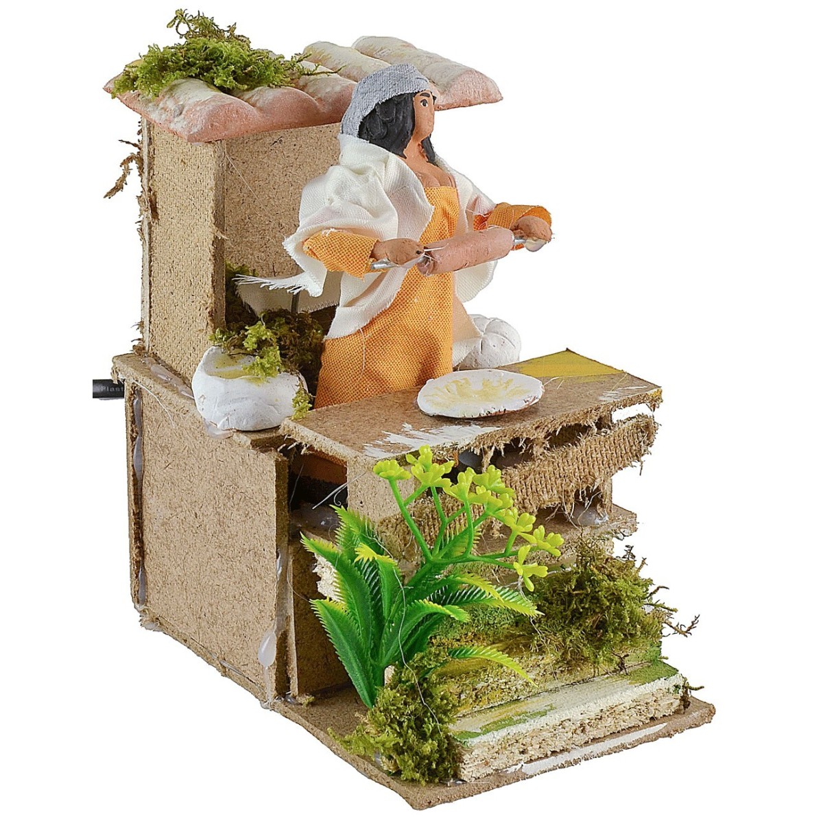 Massaia che stende l'impasto in movimento di altezza 10 cm. La donna grazie al movimento del busto su e giù simula l'azione di tirare la pasta col mattarello. Nell'ambientazione per presepe sono presenti ciuffetti di vegetazione. La statua è di terracotta con abiti in tessuto, i colori dei vestiti e del viso possono variare rispetto alla foto. L'articolo è funzionante a corrente ed è stato realizzato interamente a mano da artigiani italiani con legno sughero terracotta.