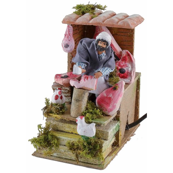 Macellaio in movimento di altezza 10 cm. L'uomo, grazie al movimento del braccio su e giù, con un coltello simula il taglio della carne. Nell'ambientazione sono presenti diversi pezzi di carne e delle galline. La statua è di terracotta con abiti in tessuto, i colori dei vestiti e del viso possono variare rispetto alla foto. Prodotto realizzato interamente a mano da artigiani italiani in legno sughero, muschio e terracotta. L'articolo è funzionante a corrente. Nei prodotti correlati visibili sotto la tabella sono presenti ulteriori accessori per arricchire ulteriormente la scena.