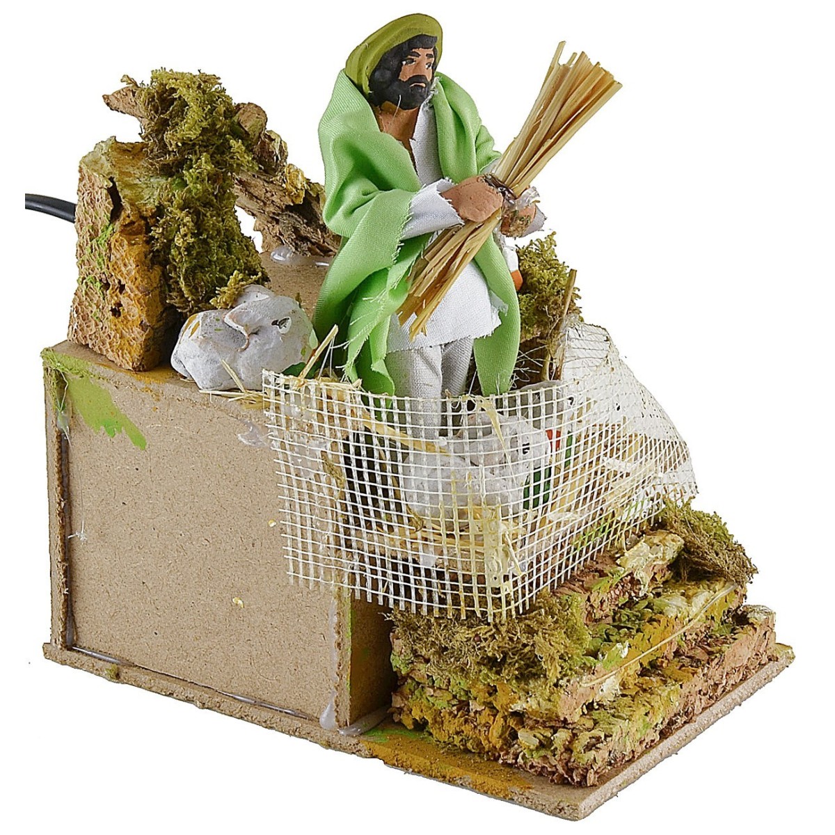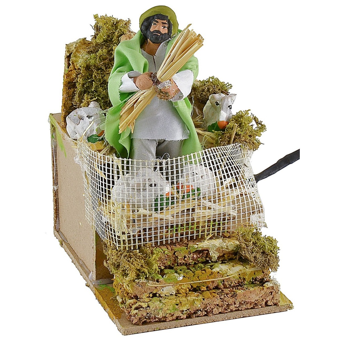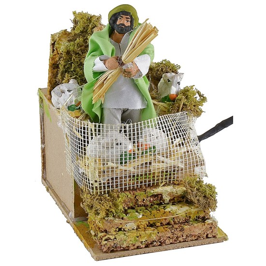 Contadino che ciba i conigli in movimento di altezza 10 cm. L'uomo grazie al movimento del busto avanti e indietro simula l'azione di porre il fieno nella conigliera. Nell'ambientazione per presepe sono presenti ciuffetti di vegetazione. La statua è di terracotta con abiti in tessuto, i colori dei vestiti e del viso possono variare rispetto alla foto. L'articolo è funzionante a corrente ed è stato realizzato interamente a mano da artigiani italiani con legno sughero terracotta.