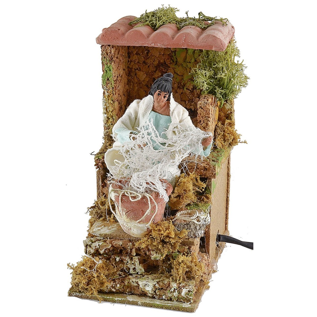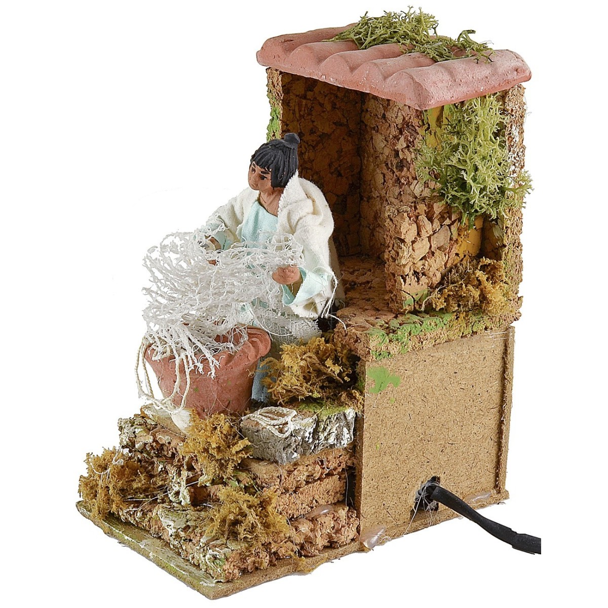 Donna che ripara la rete in movimento di altezza 10 cm. La donna grazie al movimento del busto su e giù simula l'azione di cucire. Nell'ambientazione per presepe sono presenti ciuffetti di vegetazione. La statua è di terracotta con abiti in tessuto, i colori dei vestiti e del viso possono variare rispetto alla foto. L'articolo è funzionante a corrente ed è stato realizzato interamente a mano da artigiani italiani con legno sughero terracotta.