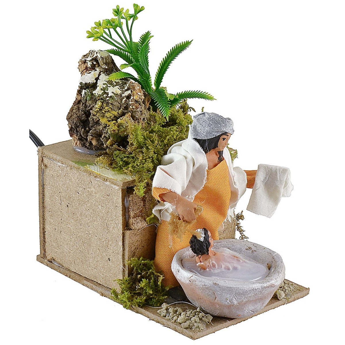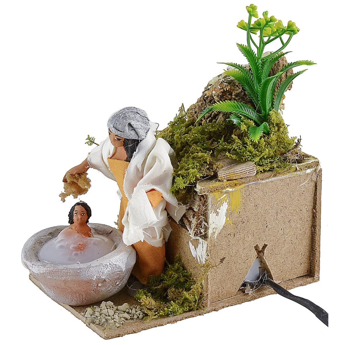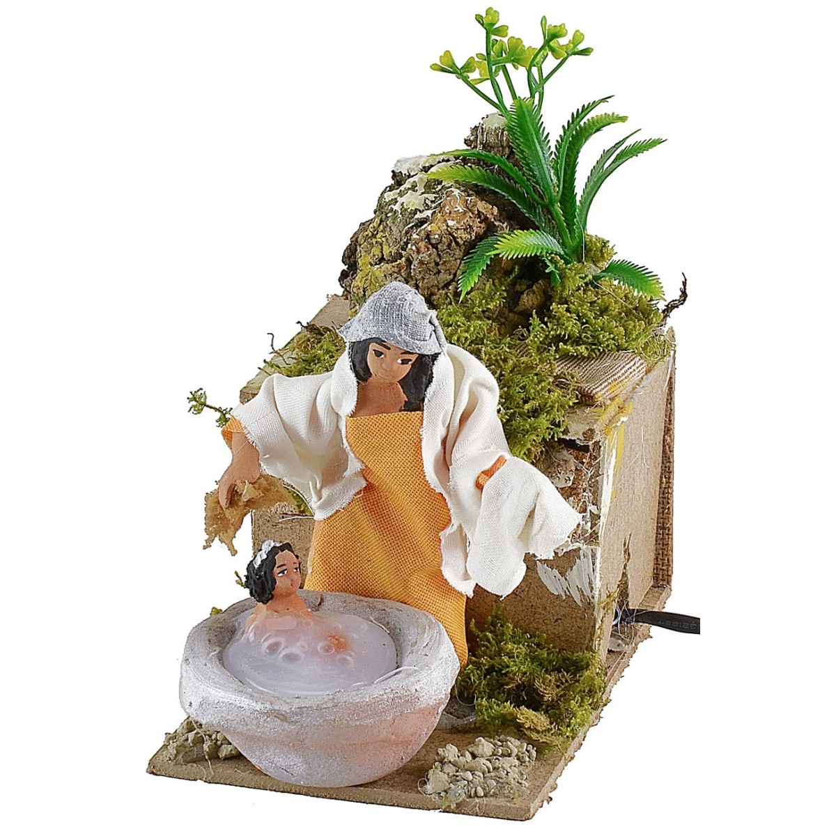 Donna in movimento che lava il bambino di altezza 10 cm. La mamma grazie al movimento del busto avanti e indietro simula l'azione di fare il bagno al bimbo. Nell'ambientazione per presepe sono presenti ciuffetti di vegetazione. La statua è di terracotta con abiti in tessuto, i colori dei vestiti e del viso possono variare rispetto alla foto. L'articolo è funzionante a corrente ed è stato realizzato interamente a mano da artigiani italiani con legno sughero terracotta.
