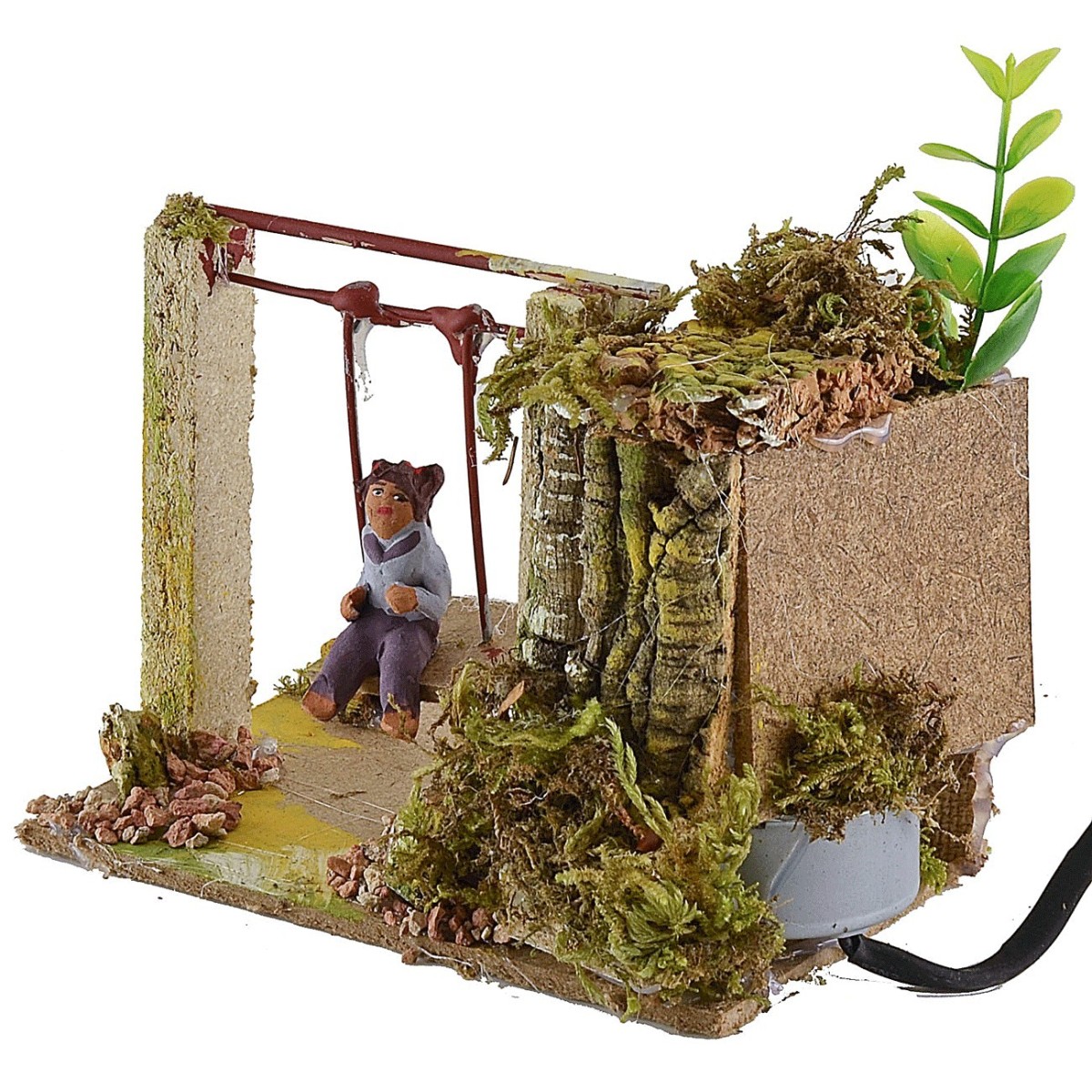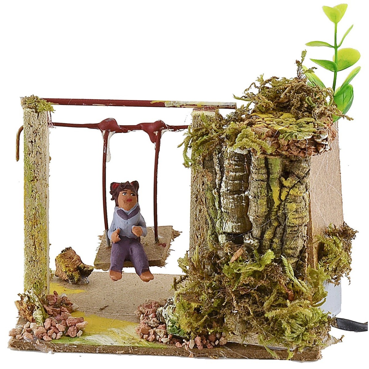 Bambino che dondola in movimento di altezza 10 cm. Il fanciullo grazie al movimento del seggiolino avanti e indietro simula un'altalena in movimento. Nell'ambientazione per presepe sono presenti ciuffetti di vegetazione. La statua è di terracotta con abiti in tessuto, i colori dei vestiti e del viso possono variare rispetto alla foto. L'articolo è funzionante a corrente ed è stato realizzato interamente a mano da artigiani italiani con legno sughero terracotta.