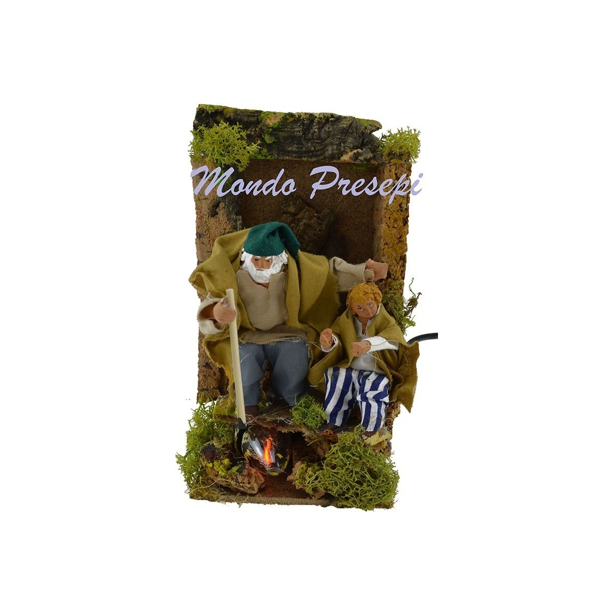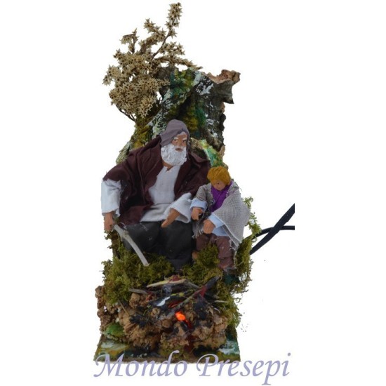 Pastore cm 10 in movimento che attizza il fuoco funzionante con bimbo.
