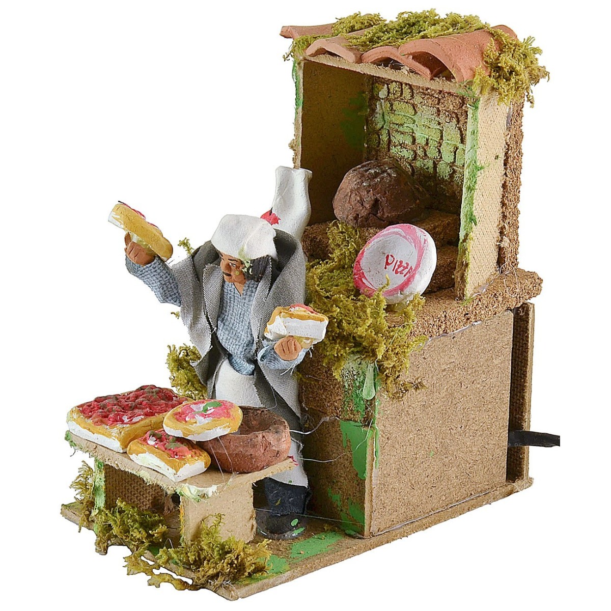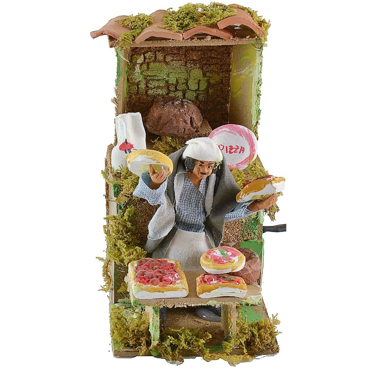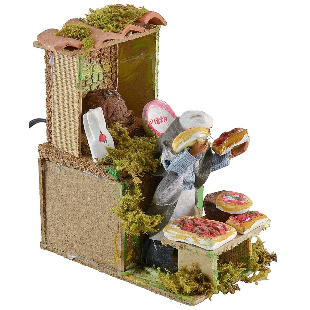 Venditore di pizze in movimento di altezza 10 cm. L'uomo grazie al movimento del busto su e giù mostra i prodotti. Nell'ambientazione per presepe sono presenti ciuffetti di vegetazione. La statua è di terracotta con abiti in tessuto, i colori dei vestiti e del viso possono variare rispetto alla foto. L'articolo è funzionante a corrente ed è stato realizzato interamente a mano da artigiani italiani con legno sughero terracotta.