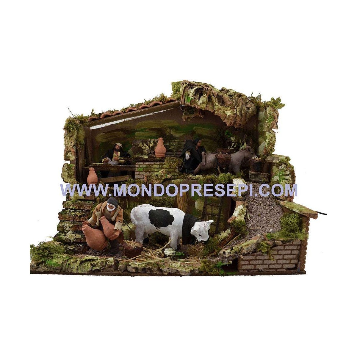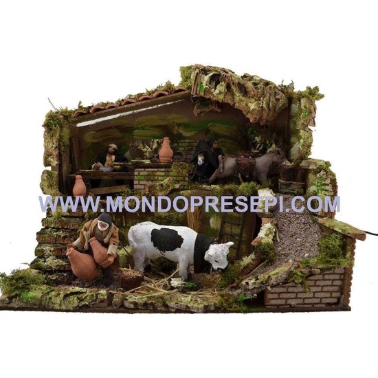 Scena con 4 movimenti: pastore con anfore sulle spalle, bue muove la testa, falegname pialla il legno e il maniscalco che martella, tutto funzionante a corrente.