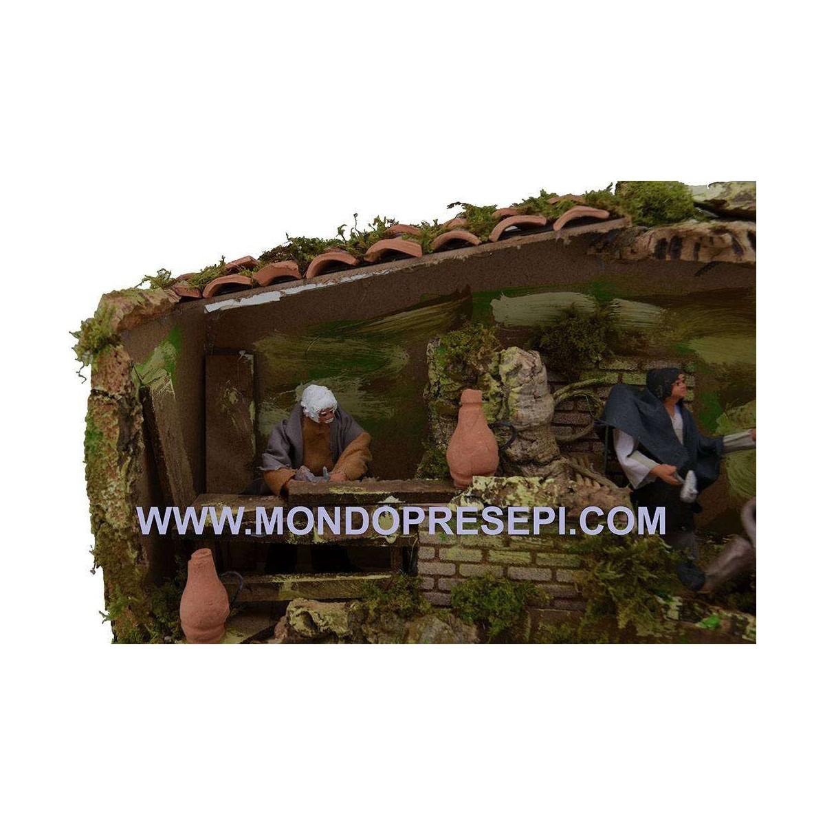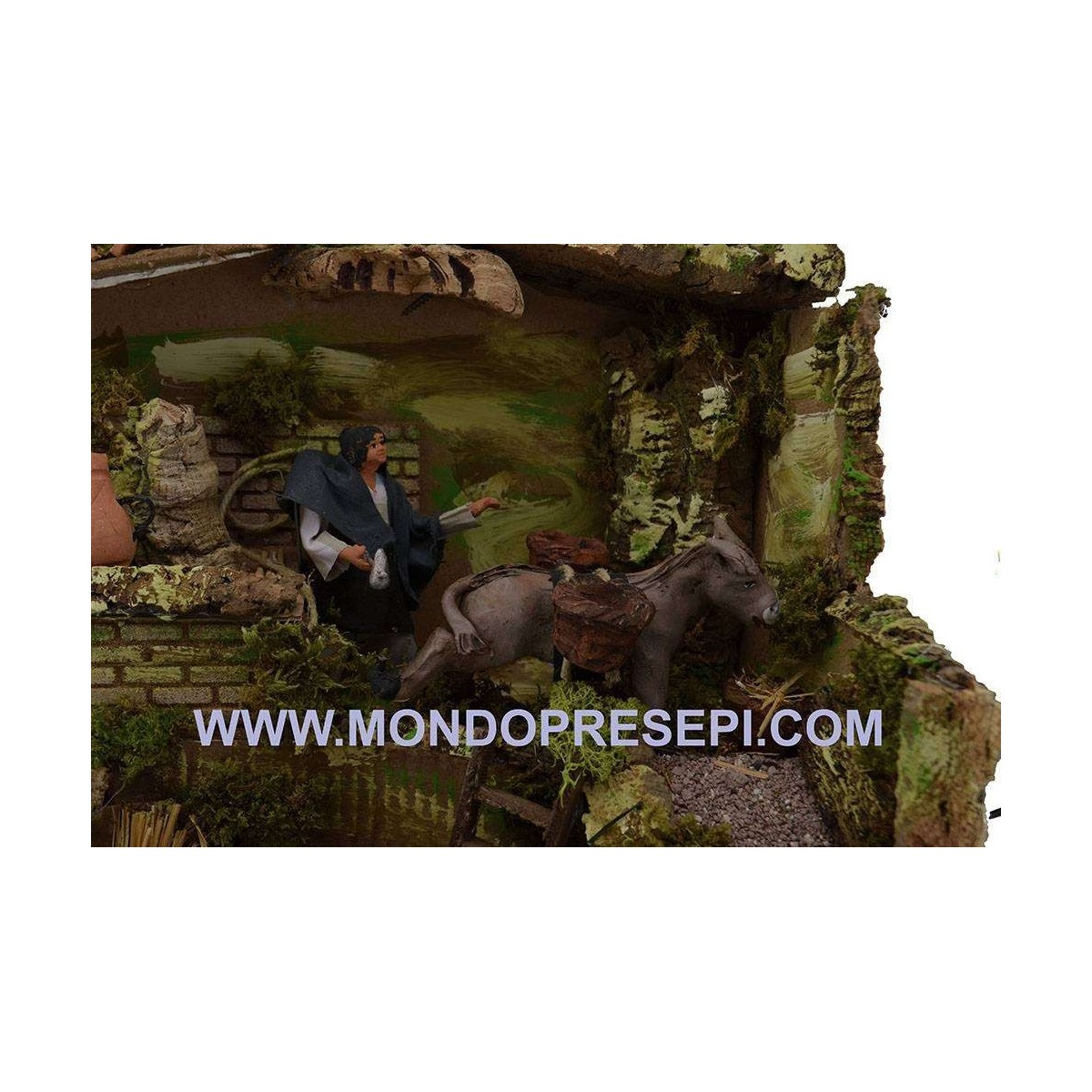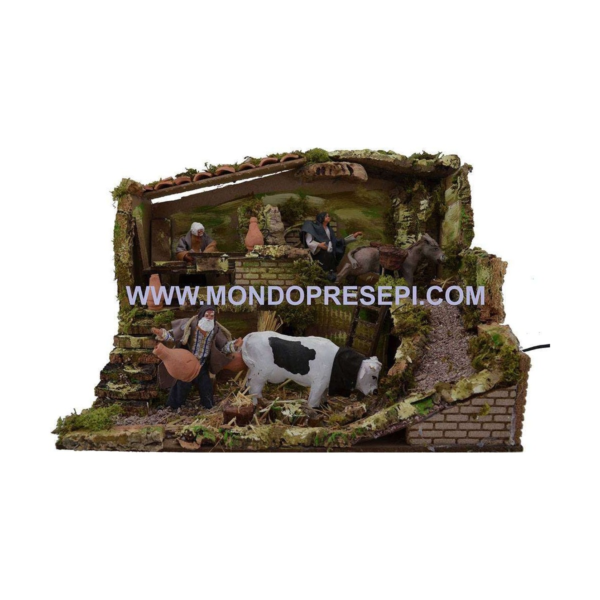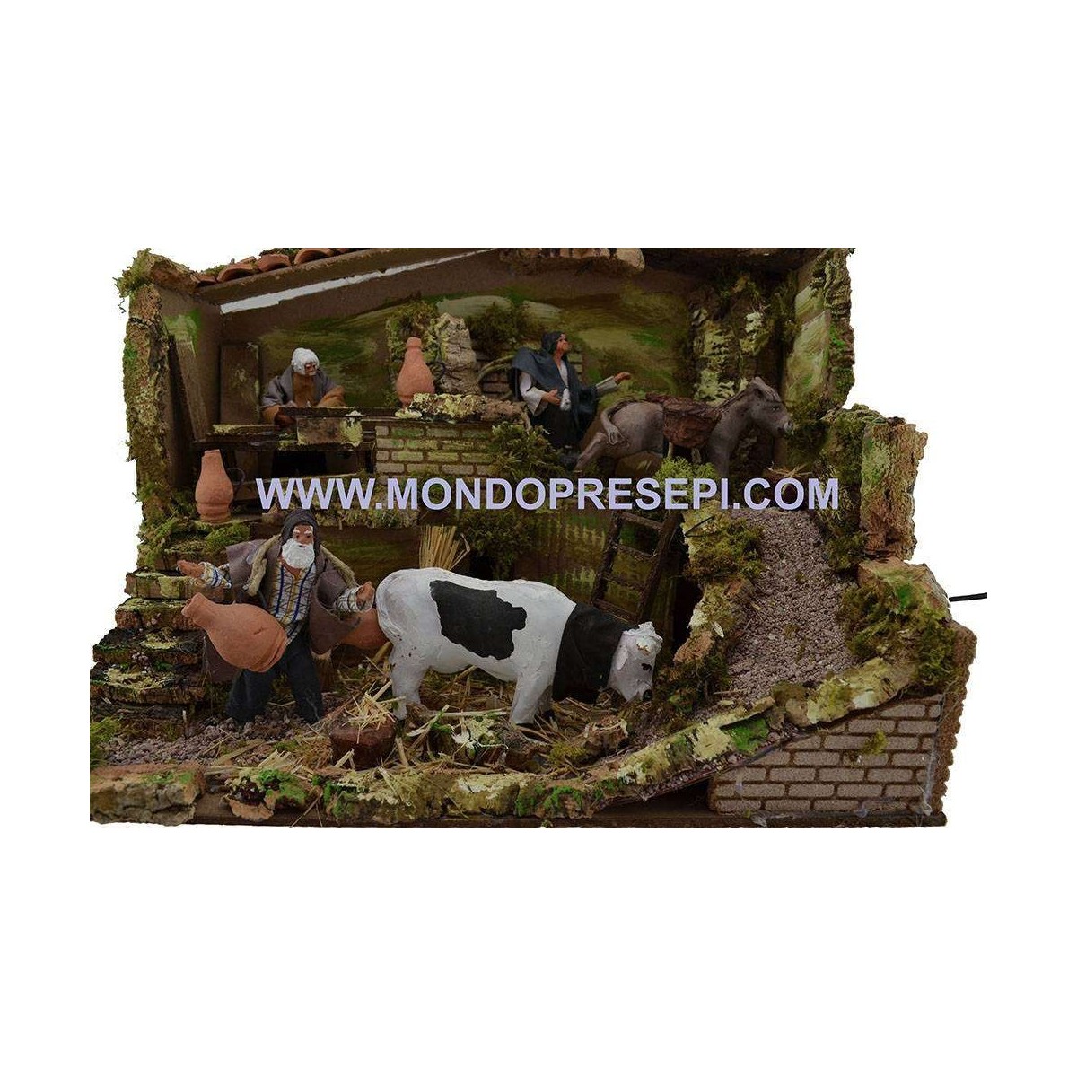 Scena con 4 movimenti: pastore con anfore sulle spalle, bue muove la testa, falegname pialla il legno e il maniscalco che martella, tutto funzionante a corrente.