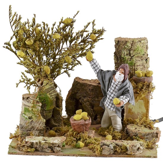 Contadino nel frutteto in movimento di altezza 12 cm. L'uomo grazie al movimento del busto su e giù simula la raccolta degli agrumi. Nell'ambientazione per presepe sono presenti ciuffetti di vegetazione. La statua è di terracotta con abiti in tessuto, i colori dei vestiti e del viso possono variare rispetto alla foto. L'articolo è funzionante a corrente ed è stato realizzato interamente a mano da artigiani italiani con legno sughero terracotta.