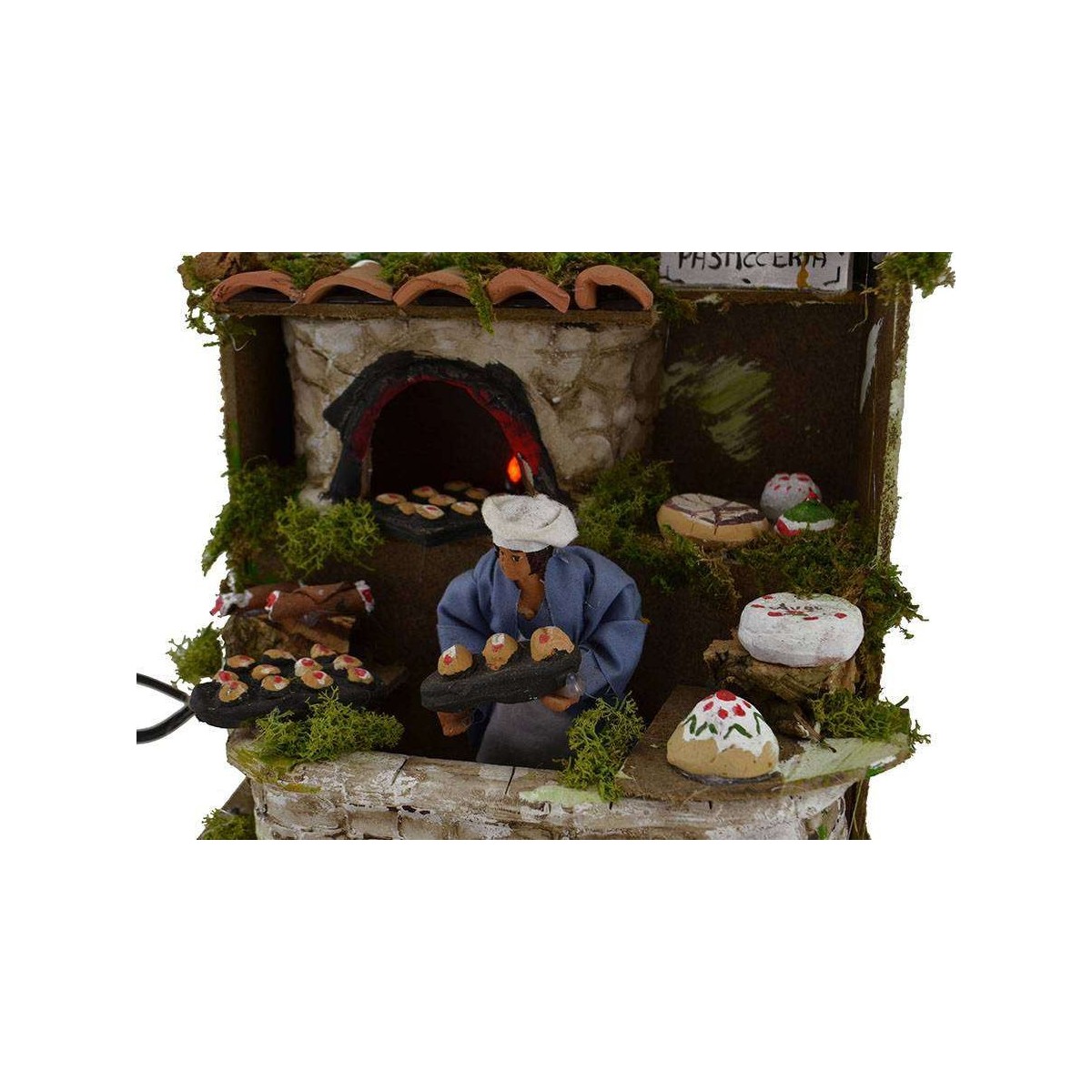 Pasticcere in movimento, in terracotta con vestiti in tessuto, muove il vassoio di pasticcini, forno con effetto fuoco il tutto funzionante a corrente.
