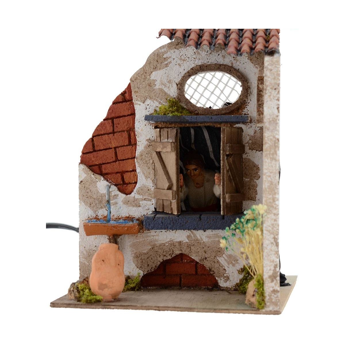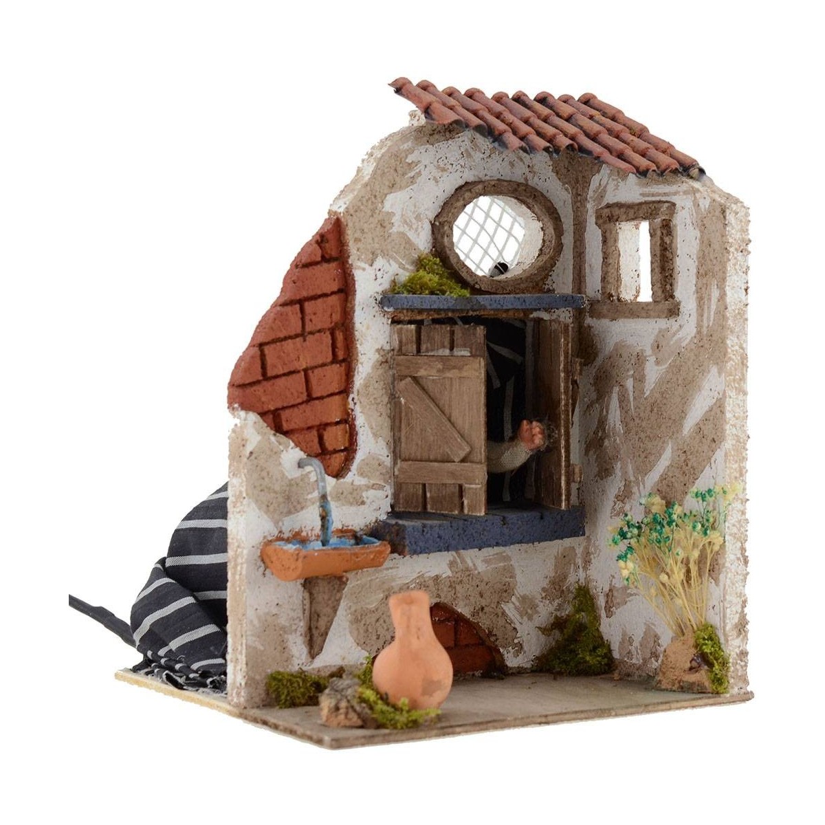 Donna in terracotta vestita in tessuto, in movimento apre le ante della casa.