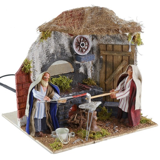 Scena fabbri 10 cm al lavoro con doppio movimento e fuoco funzionante, l'uomo scalda il ferro nella fucina e poi lo porta sull'incudine dove il fabbro martella. Le statue sono in terracotta vestite in tessuto.