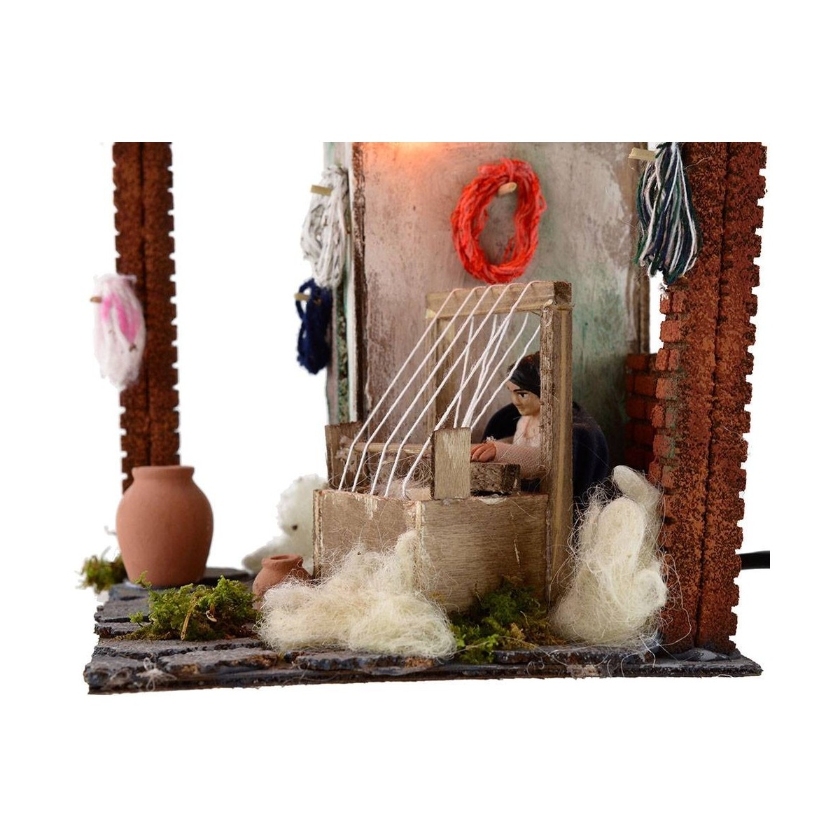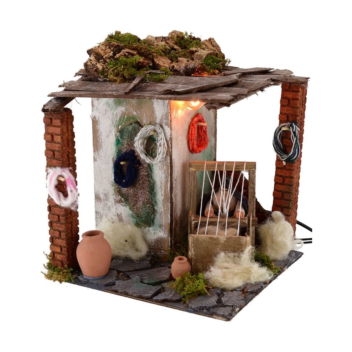 Tessitrice 10 cm in movimento, illuminata con luce funzionante a corrente. La statue è realizzata in terracotta vestita in tessuto.