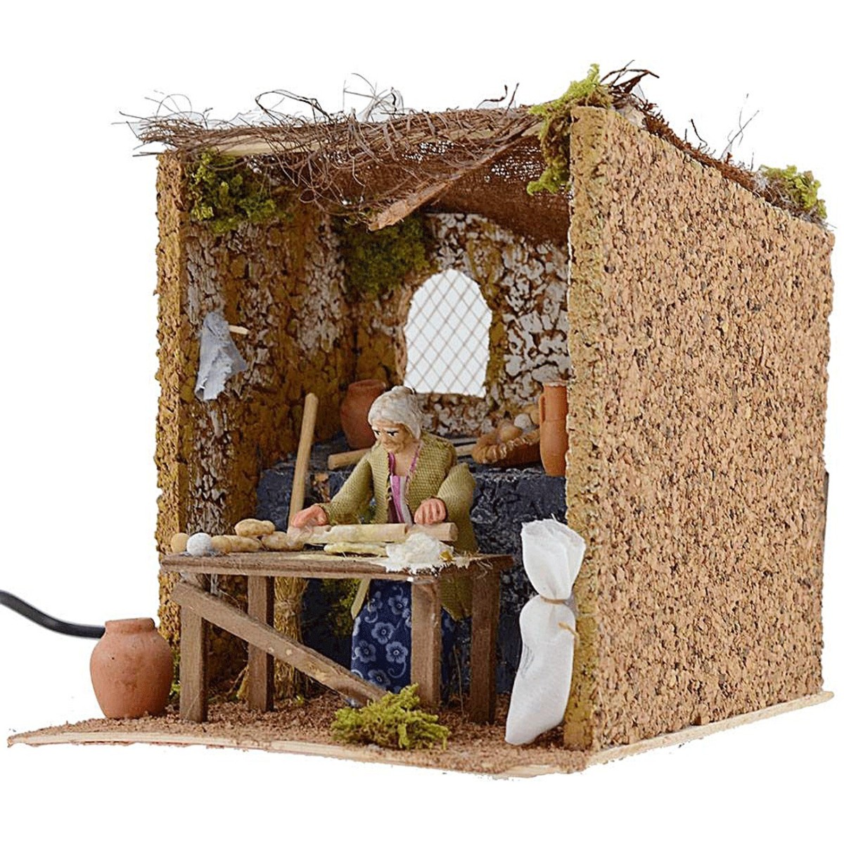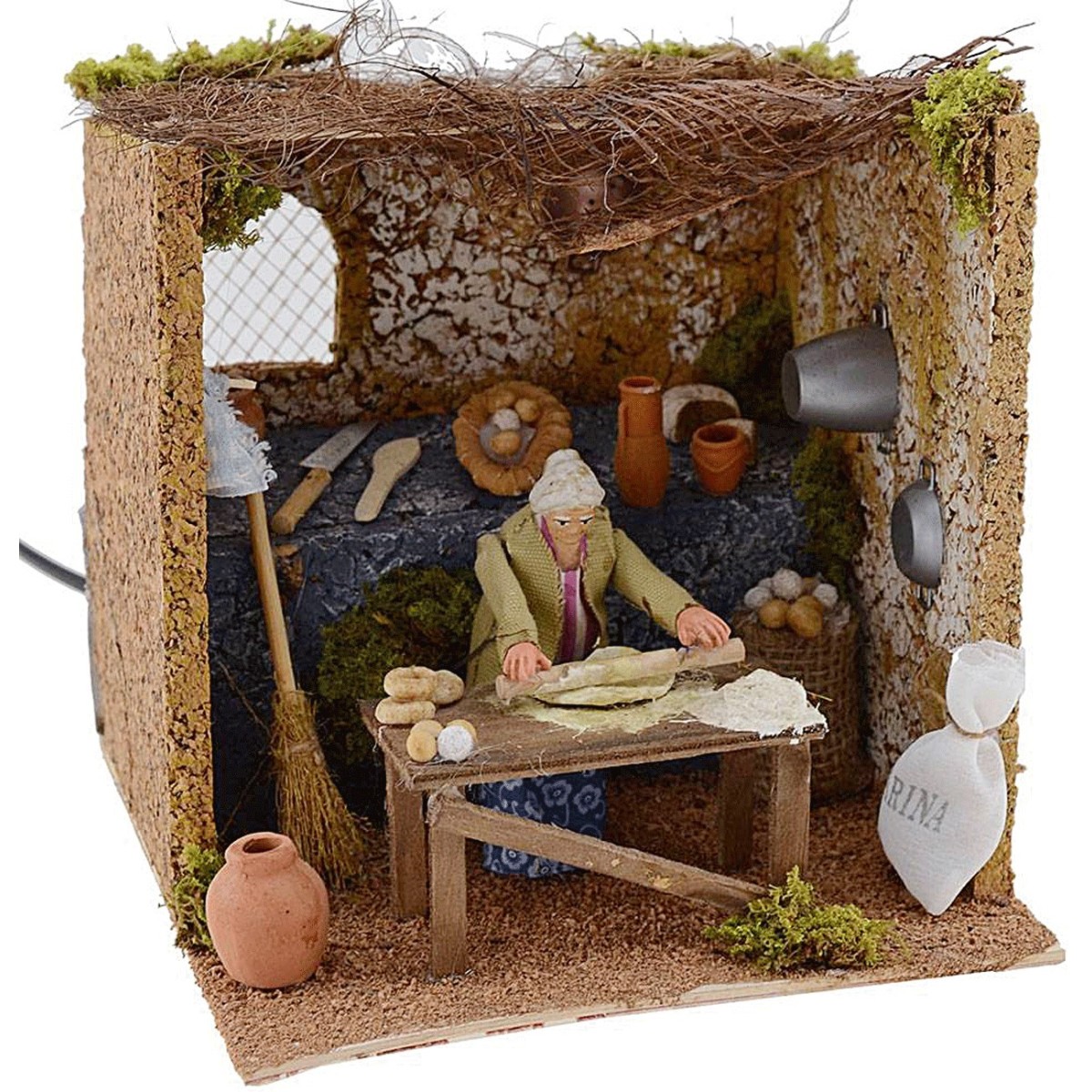 La vecchia che impasta la farina con il mattarello è in terracotta e vestita di tessuto, il movimento risulta molto realistico ed è alimentato a corrente. Questa scena è realizzata interamente in Italia a mano, ben rifinita nei dettagli con uova e pane sul tavolo in primo piano, a sinistra un vaso e sulla destra un sacco bianco di farina. In parte alla statua un scopa e un cesto grande di uova; sul ripiano retrostante sono riposti diversi accessori come vasi, formaggi e posate. Sulle pareti, come in una vera cucina professionale si possono osservare alcune pentole e canovacci appesi. Il tetto è davvero particolare e dona un senso di leggerezza all'intera raffigurazione, infatti, è compaosto da fili di corda marrone. Sullo sfondo una finestra con griglia che lascia intravedere uno scorcio sul vostro presepe.