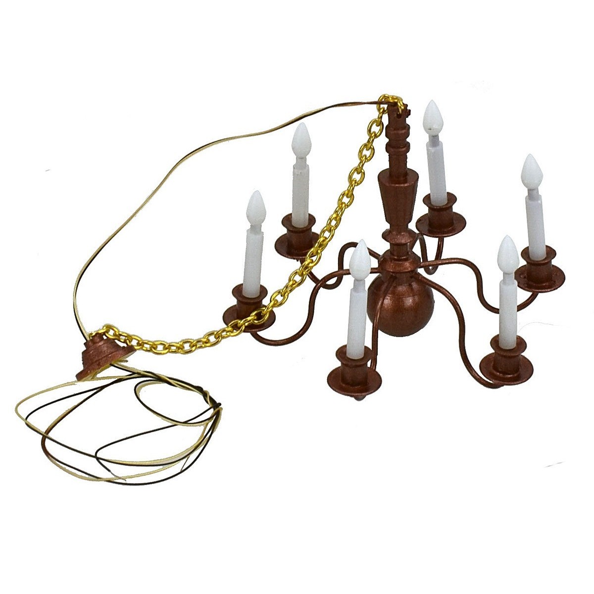 Lampadario da soffitto a 6 bracci con candele a led bianco caldo funzionanti a 3 volt. L'articolo è consigliato per illuminare le stanze interne delle case del presepe. Ai terminali dei fili è collegare la spina per la bassa tensione (non inclusa), la spinetta poi dev'esser inserita nell'alimentatore con multipresa a tensione variabile disponibile a 5 o 10 prese. In alternativa ai terminali dei fili si possono collegare direttamente dei comuni morsetti che, a loro volta, saranno inseriti nell'alimentatore universale tagliando lo spinotto presente. Tutti gli accessori sopra citati li potete trovate sotto la tabella nei prodotti correlati.