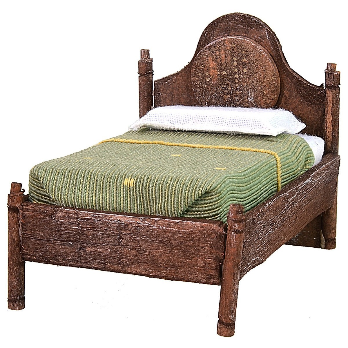 Letto a una piazza in legno scuro antichizzato ideale per Presepe o case di bambole con testata ondulata e decorata da un soprarilievo circolare. L'articolo è stato prodotto da artigiani italiani ed è consigliato per statue di altezza 12 cm. Nei prodotti correlati sotto la tabella sono presenti altri complementi d'arredo della stessa serie per poter completare le vostre ambientazioni. si fa presente che essendo un prodotto artigianale i colori del copriletto potrebbero variare.