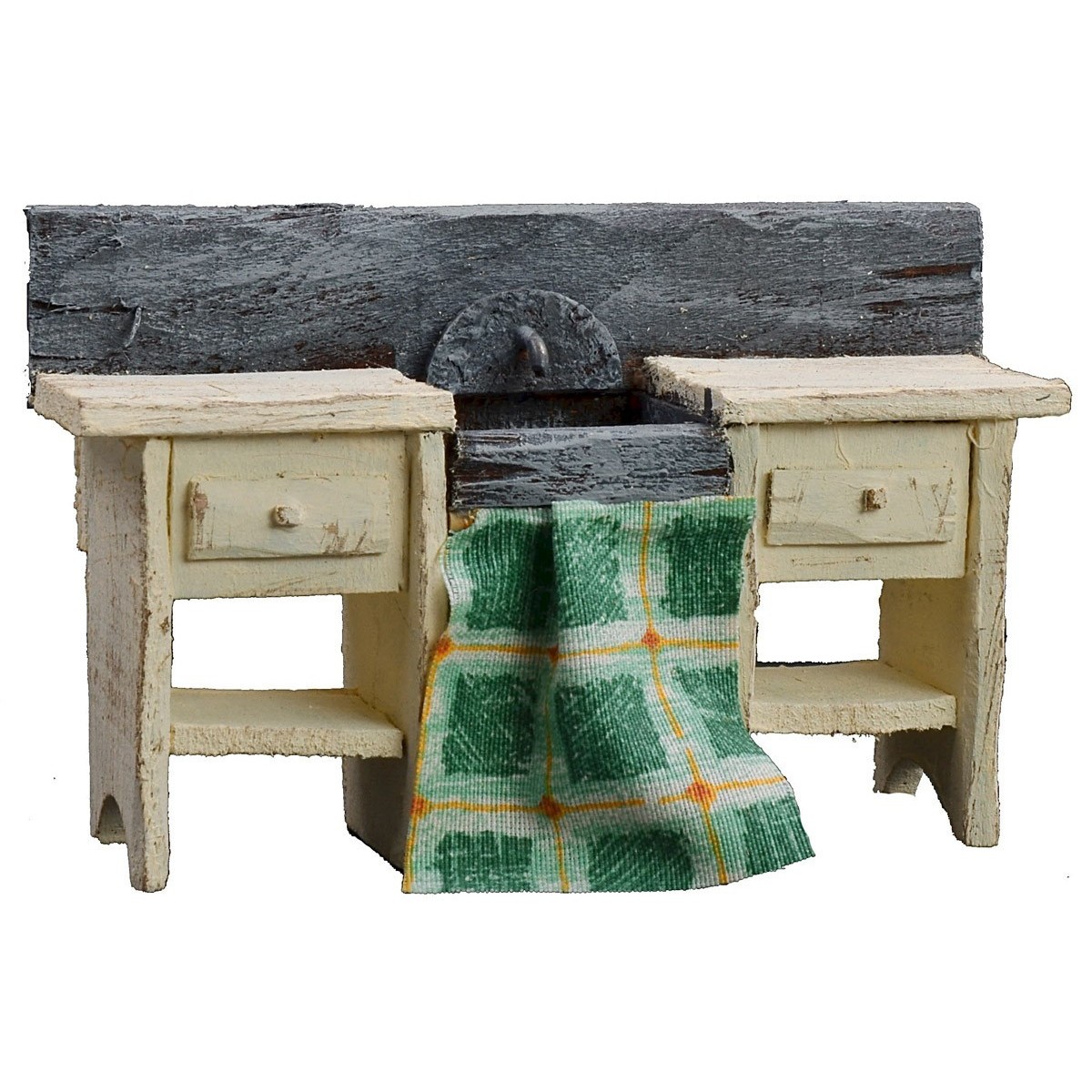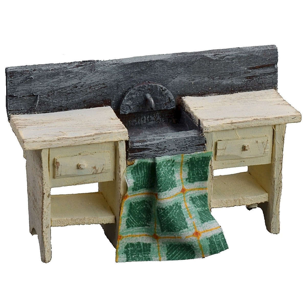 Lavello da cucina chiaro con cassettiere laterali e decorato da un asciugamano verde, l'oggetto è ideale per il Presepe fai da te o le case delle bambole. L'articolo è stato prodotto da artigiani italiani ed è consigliato per statue di altezza 12 cm. Nei prodotti correlati sotto la tabella sono presenti altri complementi d'arredo della stessa serie per poter completare le vostre ambientazioni.