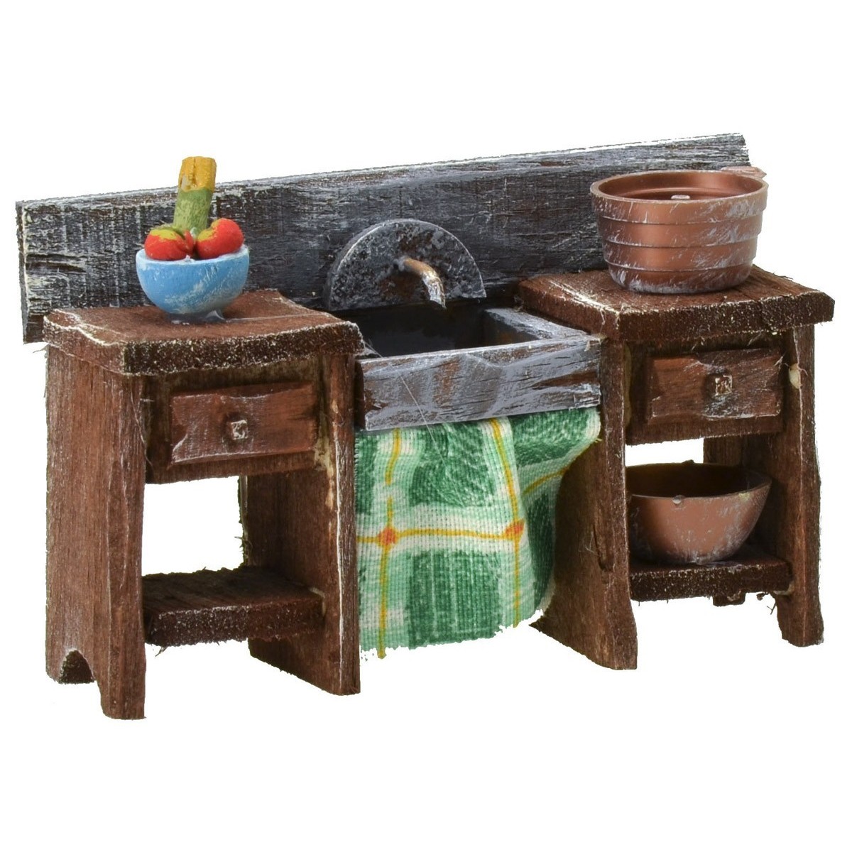 Lavello da cucina in legno scuro invecchiato con cassettiere laterali e decorato da un asciugamano verde, ideale per il Presepe fai da te o le case delle bambole. L'articolo è stato prodotto da artigiani italiani ed è consigliato per statue di altezza 10 cm. Nella sezione dedicata alle MINUTERIE sono presenti tanti accessori per completare l'ambientazione.