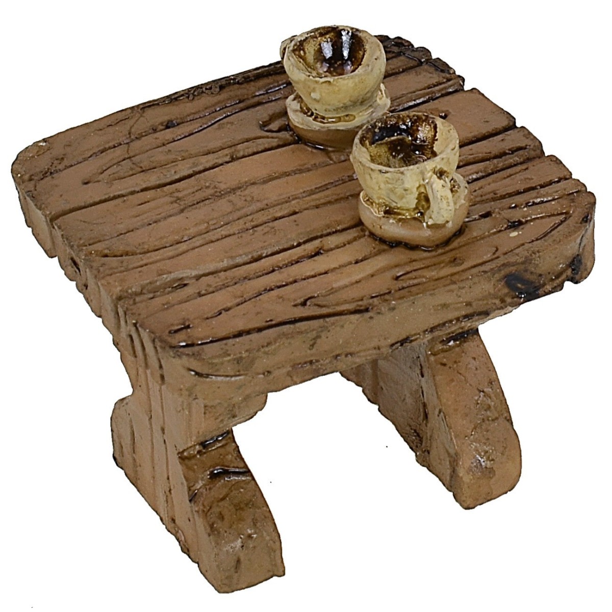 Tavolo in resina effetto legno, sul piano sono riposte due tazze. Il prodotto è consigliato per statuine di altezza 6-6,5 cm.