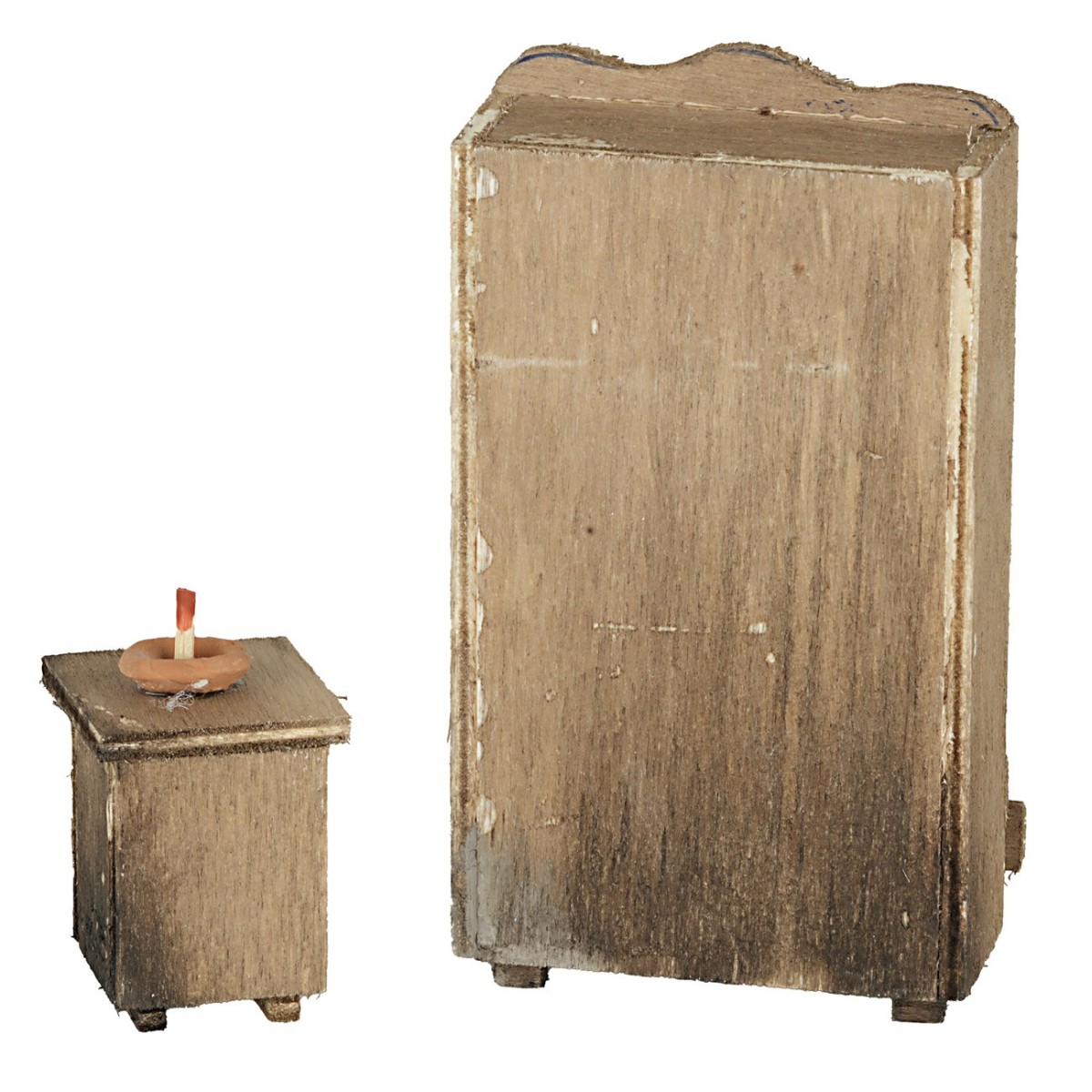 Mobili da camera in legno, ideali per completare case di bambole o presepi. Il set comprende un armadio e un comodino. L’anta dell’armadio si apre, rivelando al suo interno piccoli tessuti e accessori. Sul comodino è presente una piccola candela. L'articolo è prodotto artigianalmente da artigiani italiani ed è consigliato per statue di altezza 6,5-8 cm.”