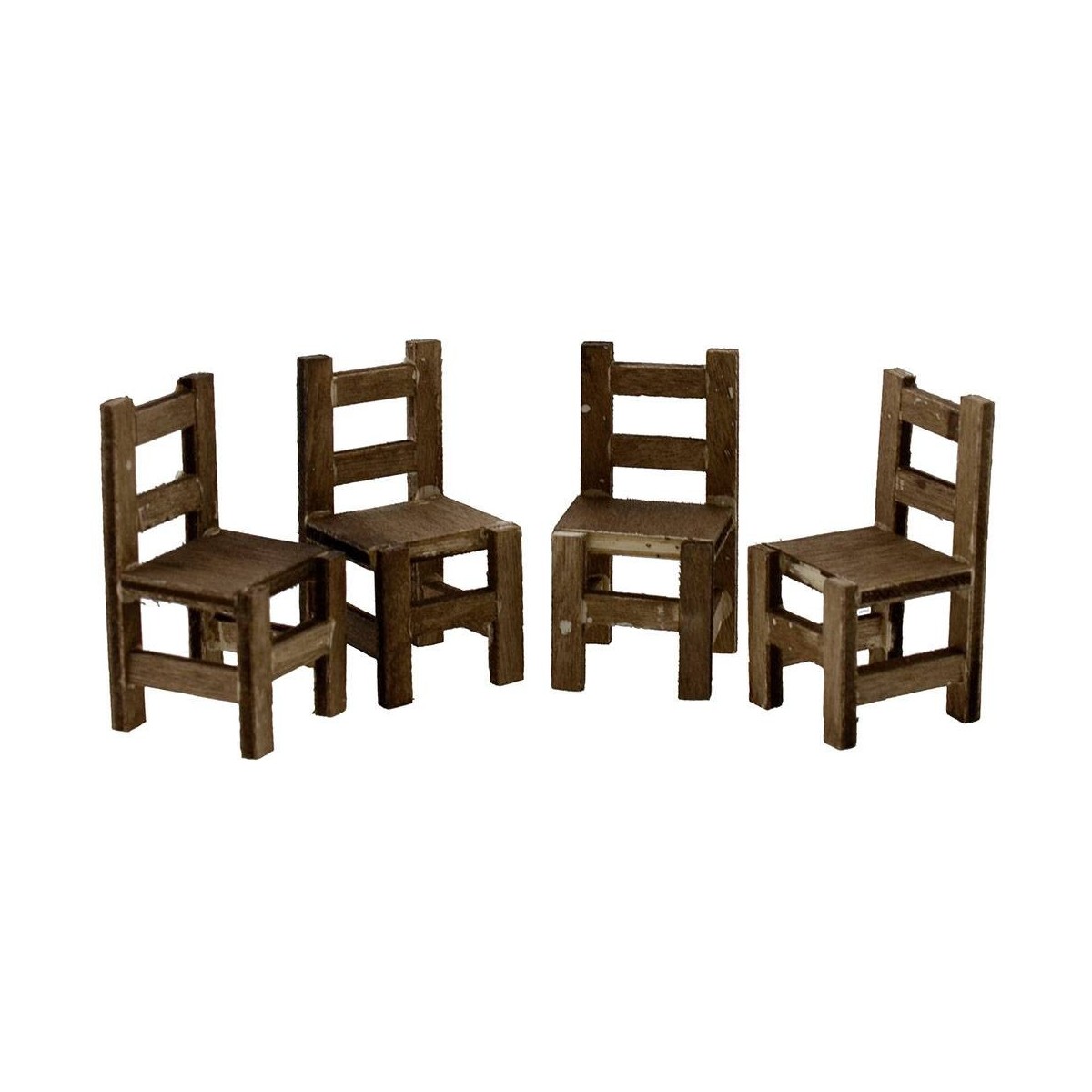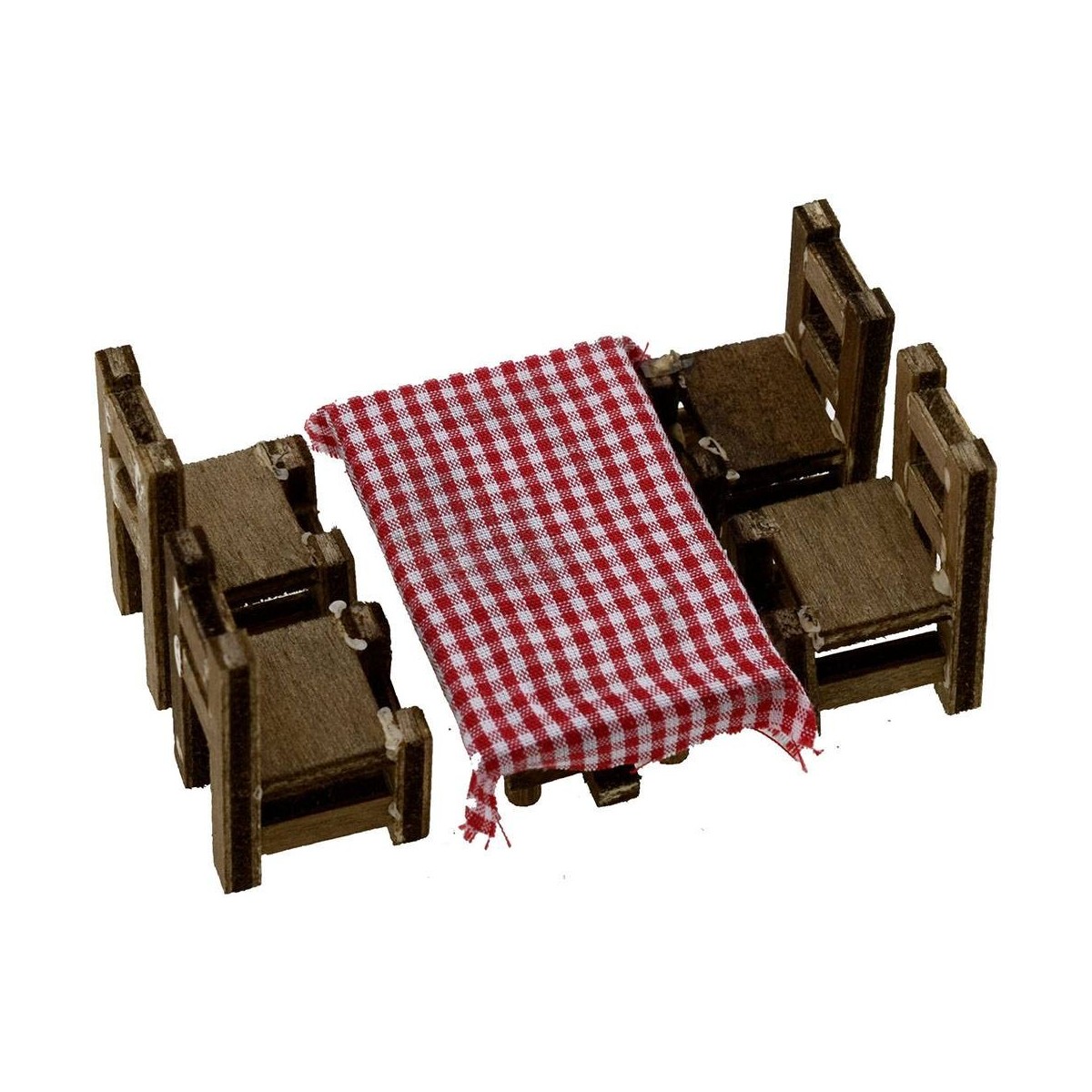Tavolo in legno con tovaglia e 4 sedie, consigliato per statue altezza 8-10 cm.