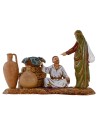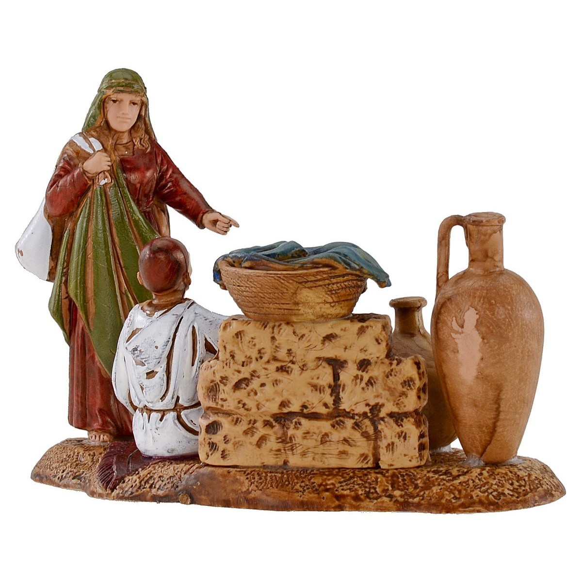Scena uomo orientale seduto che vende anfore serie 10 cm Landi Moranduzzo. Si precisa che la sopracitata serie misura realmente circa 8,5-9 cm di altezza. Le statue di questo marchio si caratterizzano per la cura nell'espressività dei volti e di ogni singolo dettaglio, infatti tutte le serie firmate Landi sono prodotte e dipinte a mano in Italia.