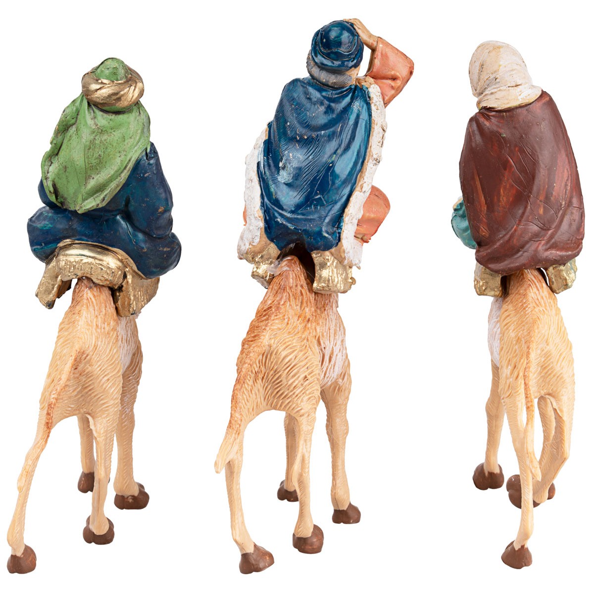 Set composto da tre Re Magi seduti su cammello, serie 10 cm. Realizzati in pvc, prodotti in Italia.