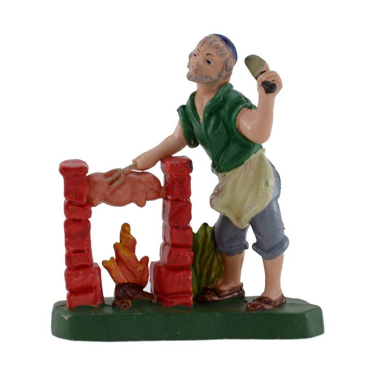 Uomo che cuoce la porchetta allo spiedo 10 cm, statua per presepe in pvc.