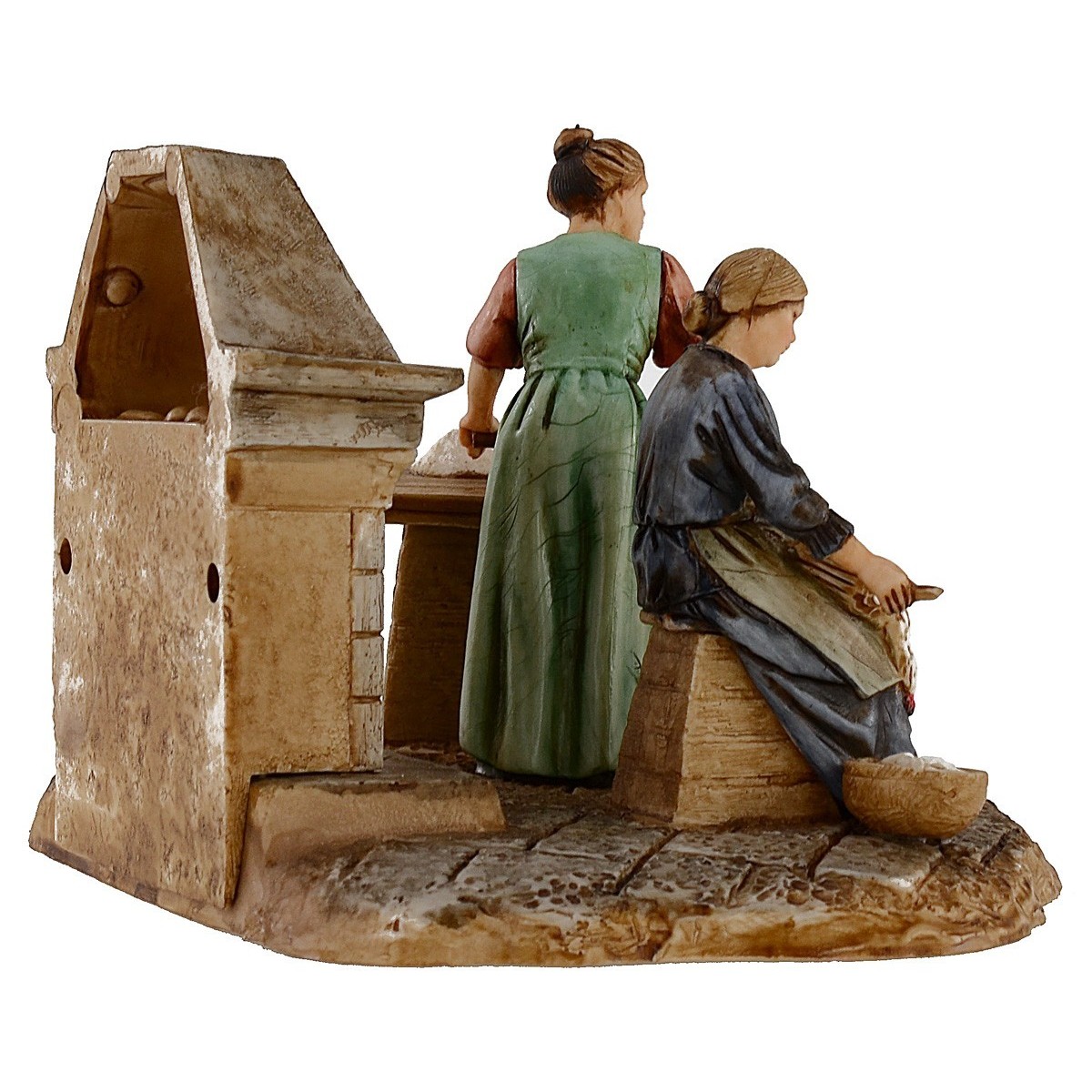 Scena con donne in cucina: la donna con mattarello e donna che spenna serie 10 cm Landi Moranduzzo. Si precisa che la sopracitata serie misura realmente circa 8,5-9 cm di altezza. Le statue di questo marchio si caratterizzano per la cura nell'espressività dei volti e di ogni singolo dettaglio, infatti tutte le serie firmate Landi sono prodotte e dipinte a mano in Italia.