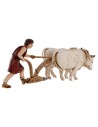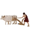 Scena con due buoi che trascinano l'aratro condotto dal contadino serie 10 cm Landi Moranduzzo. Si precisa che la sopracitata serie misura realmente circa 8,5-9 cm di altezza. Le statue di questo marchio si caratterizzano per la cura nell'espressività dei volti e di ogni singolo dettaglio, infatti tutte le serie firmate Landi sono prodotte e dipinte a mano in Italia.