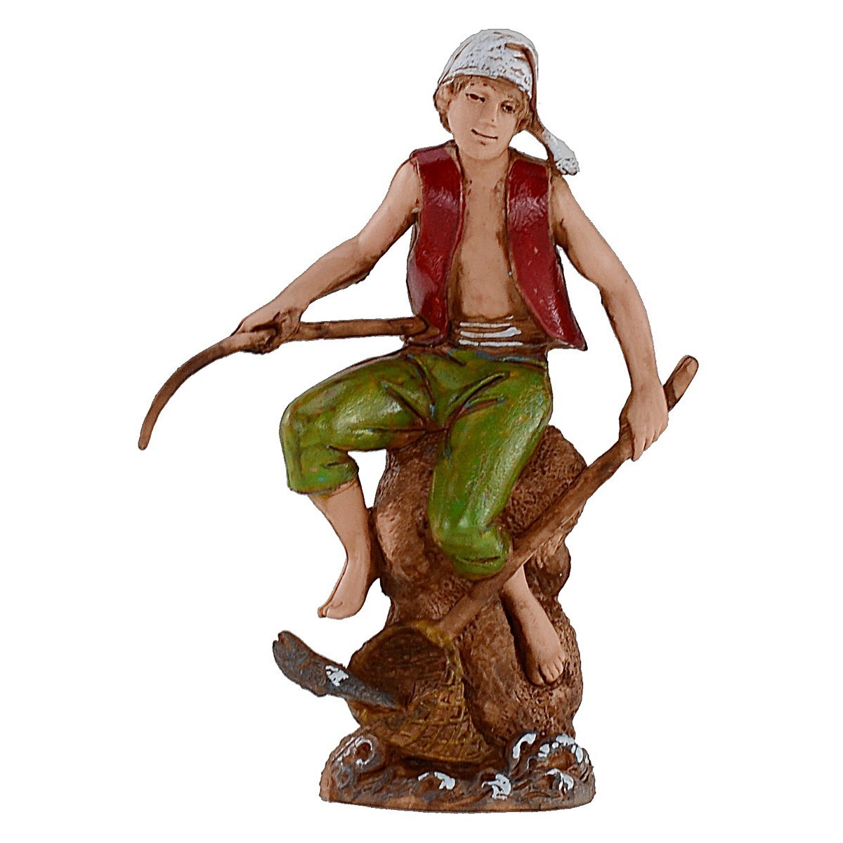 Uomo seduto su uno scoglio che pesca serie 10 cm Landi Moranduzzo. Si precisa che la sopracitata serie misura realmente circa 8,5-9 cm di altezza. Le statue di questo marchio si caratterizzano per la cura nell'espressività dei volti e di ogni singolo dettaglio, infatti tutte le serie firmate Landi sono prodotte e dipinte a mano in Italia.