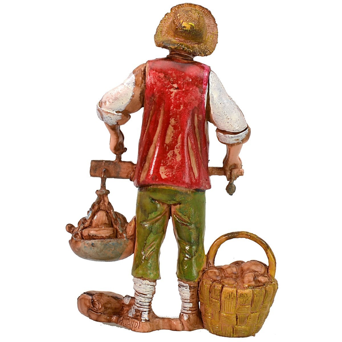 Venditore con bilancia e cesto di funghi serie 10 cm Landi Moranduzzo. Si precisa che la sopracitata serie misura realmente circa 8,5-9 cm di altezza. Le statue di questo marchio si caratterizzano per la cura nell'espressività dei volti e di ogni singolo dettaglio, infatti tutte le serie firmate Landi sono prodotte e dipinte a mano in Italia.