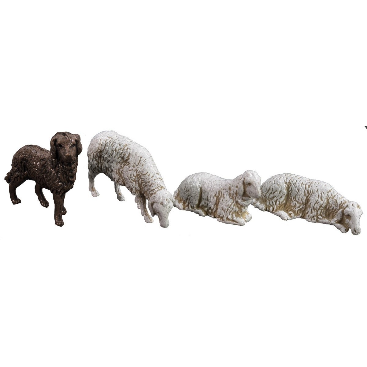 Set composto da 6 pecore in varie posture, un cane e una capra serie 10 cm Landi Moranduzzo. L'articolo è consigliato per statue di altezza 10 cm.