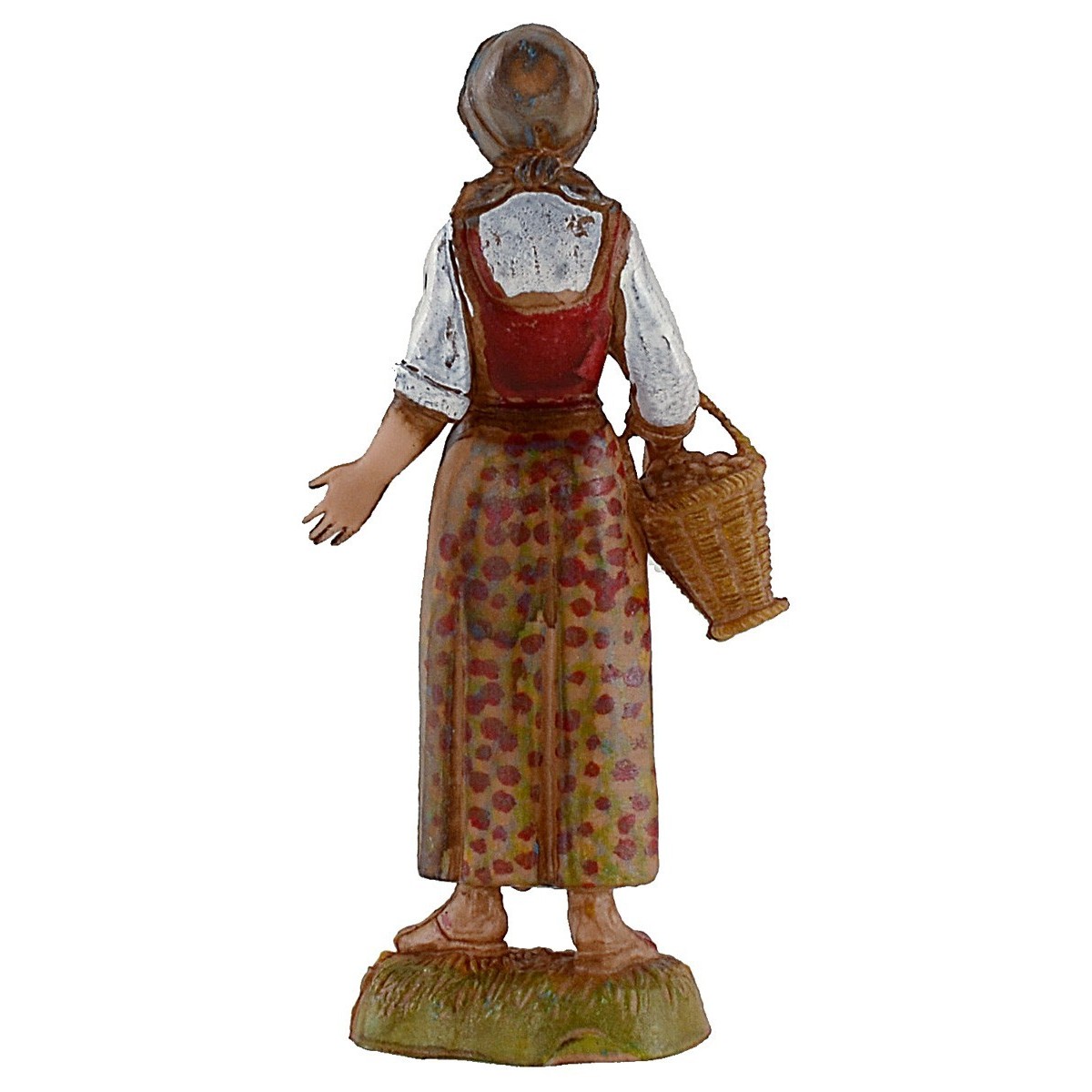 Giovane donna con cesto al braccio serie 10 cm Landi Moranduzzo. Si precisa che la sopracitata serie misura realmente circa 8,5-9 cm di altezza. Le statue di questo marchio si caratterizzano per la cura nell'espressività dei volti e di ogni singolo dettaglio, infatti tutte le serie firmate Landi sono prodotte e dipinte a mano in Italia.