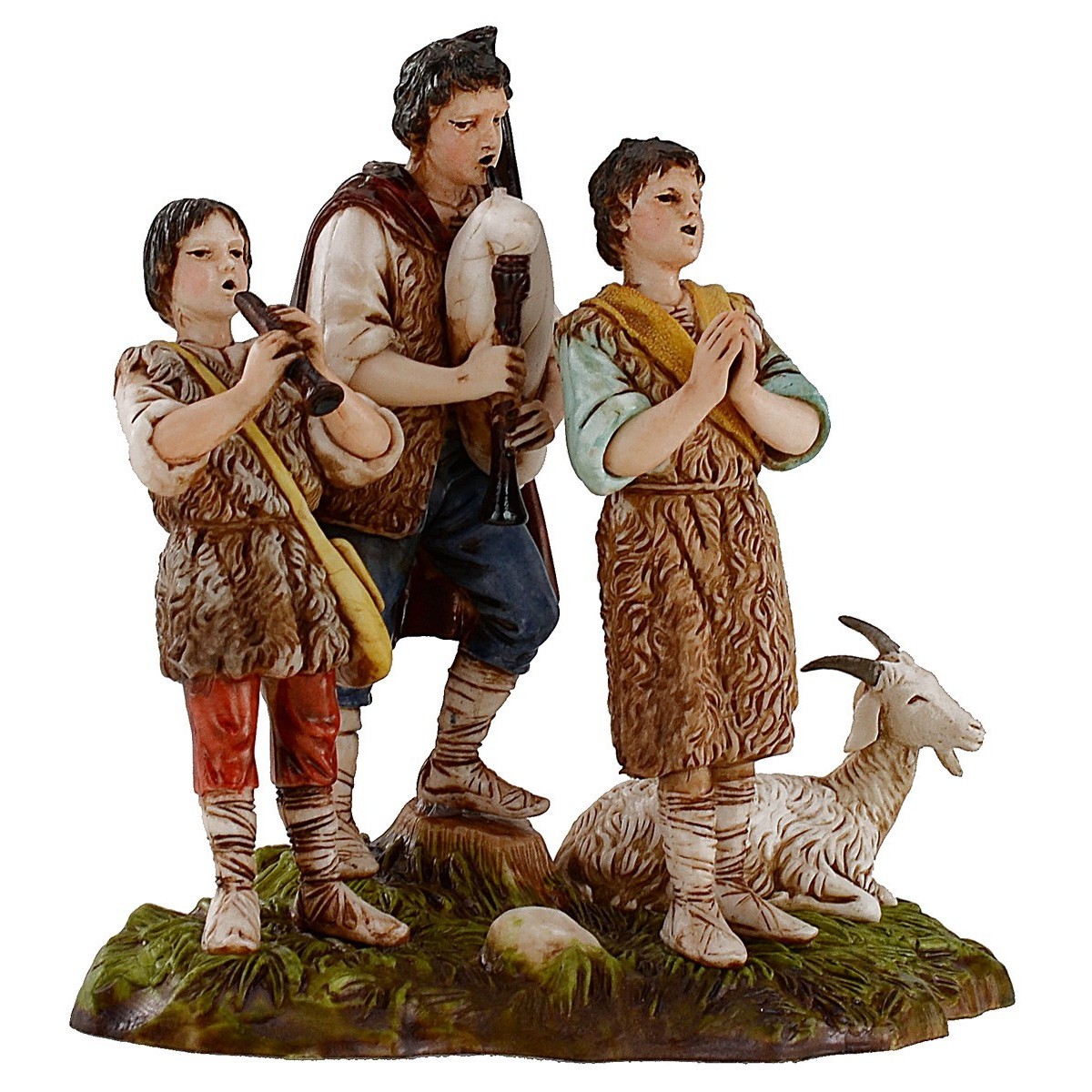 Gruppo di zampognari con capra seduta serie 10 cm Landi Moranduzzo. Si precisa che la sopracitata serie misura realmente circa 8,5-9 cm di altezza. Le statue di questo marchio si caratterizzano per la cura nell'espressività dei volti e di ogni singolo dettaglio, infatti tutte le serie firmate Landi sono prodotte e dipinte a mano in Italia.