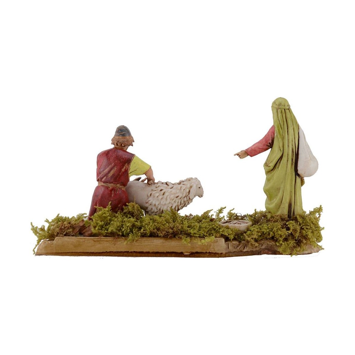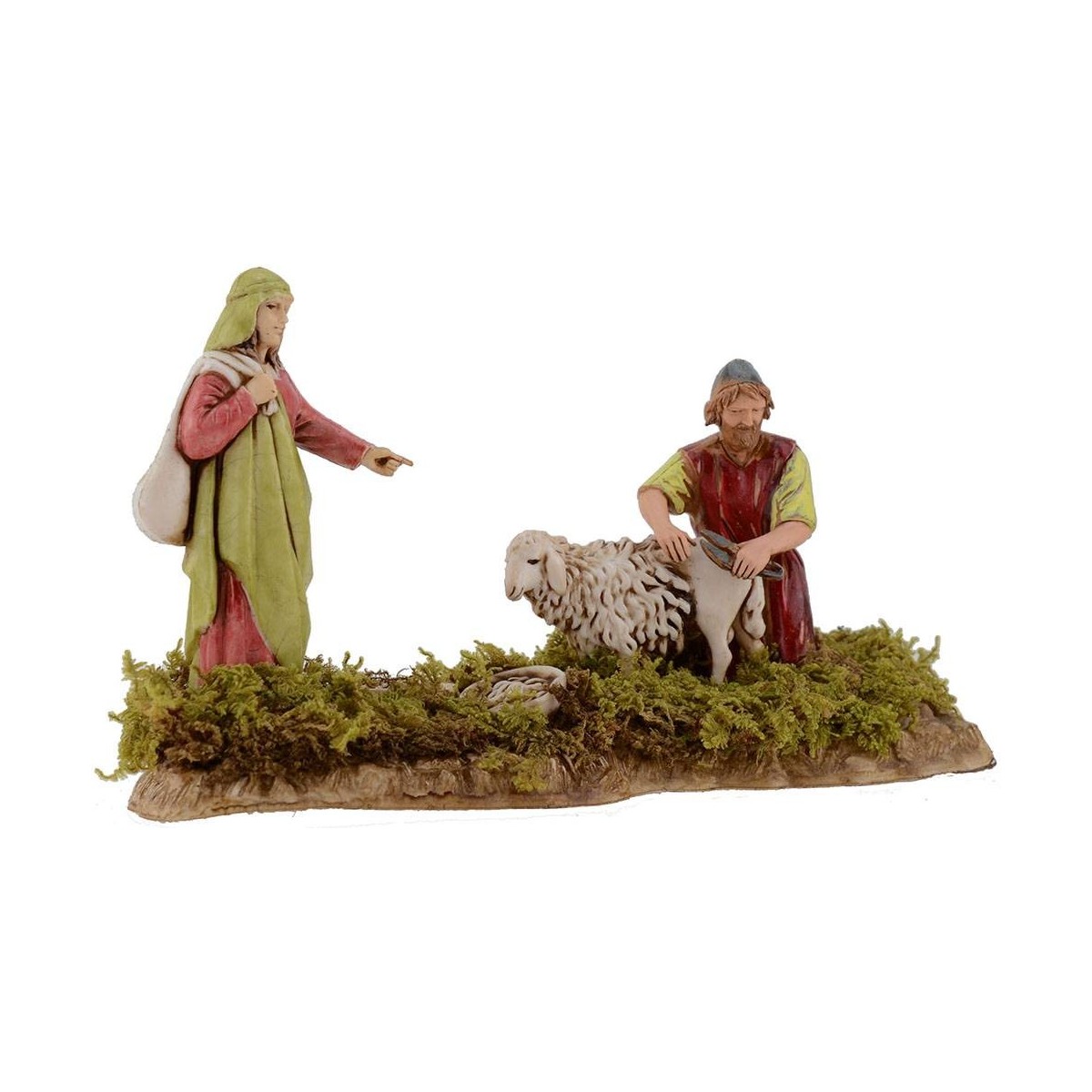 Pastore che tosa la pecora con contadina vicino serie 10 cm Landi Moranduzzo. Si precisa che la sopracitata serie misura realmente circa 8,5-9 cm di altezza. Le statue di questo marchio si caratterizzano per la cura nell'espressività dei volti e di ogni singolo dettaglio, infatti tutte le serie firmate Landi sono prodotte e dipinte a mano in Italia.