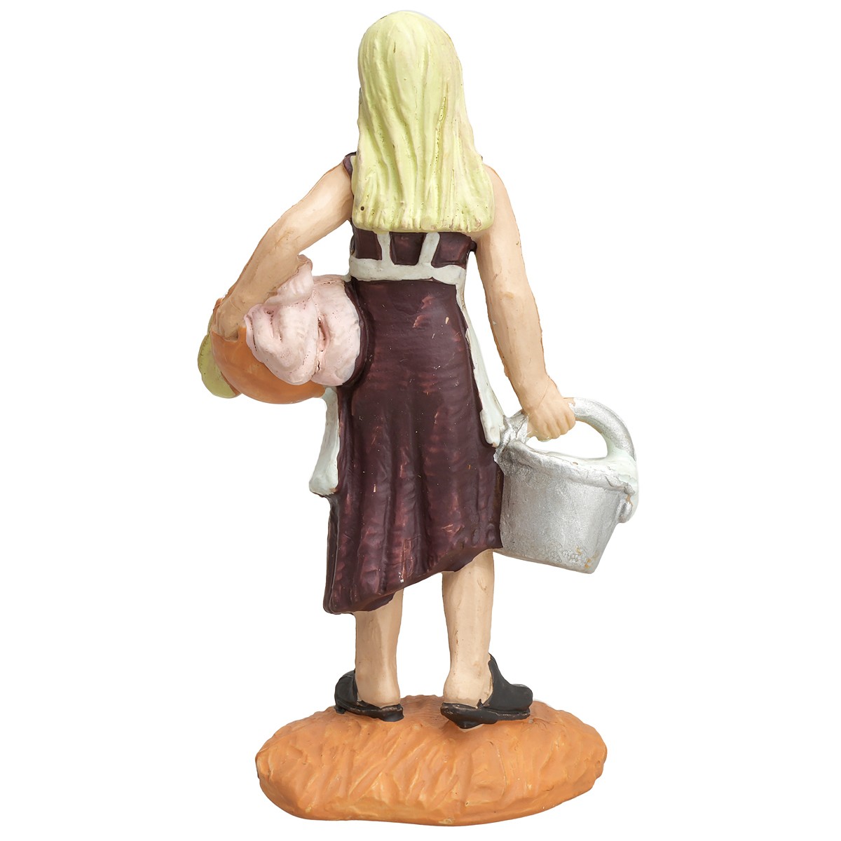 La statua è dipinta a mano con attenzione ai minimi dettagli, come l’abbigliamento semplice, il grembiule e la postura della scena.